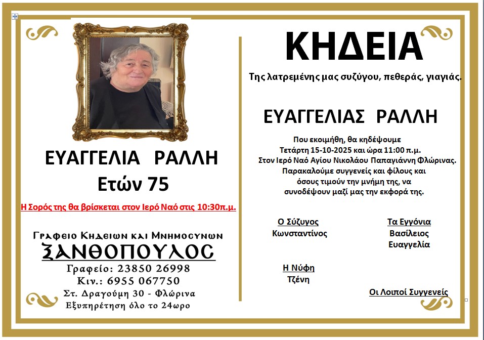 ΚοινωνικάΚηδεία της Ευαγγελίας Ράλλη, ετών 75 Τρίτη 14 Οκτωβρίου, 2025 14:20 florinapress.gr SHARE Ίσως να ενδιαφέρει ... Ευχαριστήρια μηνύματα του Συνδέσμου Μοναστηριωτών και των Πέριξ εν Φλωρίνη «Η ΕΛΠΙΣ» Κηδεία του Αλέξανδρου Γουστέρη, ετών 84 Κηδεία της Μαριάνας Νικολαΐδου, ετών 49 Κηδεία της Σοφίας Κατικαρίδου, ετών 87 Τεσσαρακονθήμερο μνημόσυνο της Μαρίας Αμοιρίδου Share Ακολουθήστε μας8.4kFollowersLikeΤελευταία νέα 3χ3 για τις Σάρισες2 στους άντρες Αθλητισμός Κυριακή 9 Νοεμβρίου, 2025 Αποτελέσματα Αγώνων Α’ & Β’ Κατηγορίας ΕΠΣ Φλώρινας 8 & 9/11/2025 Αθλητισμός Κυριακή 9 Νοεμβρίου, 2025 Κηδεία του Γεωργίου Τουτουντζή, ετών 79 Κοινωνικά Κυριακή 9 Νοεμβρίου, 2025 Πρόγραμμα επισκέψεων των Κινητών Μονάδων Υγείας σε απομακρυσμένες Κοινότητες του Δήμου Αμυνταίου Κοινωνία Κυριακή 9 Νοεμβρίου, 2025