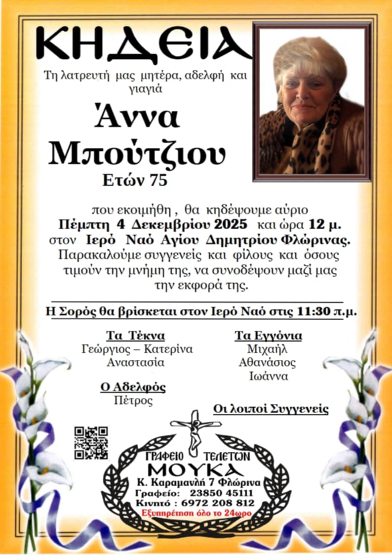 ΚοινωνικάΚηδεία της Άννας Μπούτζιου, ετών 75 Τετάρτη 3 Δεκεμβρίου, 2025 15:17 florinapress.gr SHARE Ίσως να ενδιαφέρει ... Συλλυπητήριο μήνυμα του Συνδέσμου Εργολάβων – Ηλεκτρολόγων Φλώρινας Κηδεία της Άννας Παπαδημητρίου Κηδεία της Σοφίας Σιδηροπούλου Κηδεία του Παντελή Σαμπαλή, ετών 76 Κηδεία της Ζωοπηγής Δελημιχάλη Share Ακολουθήστε μας8.4kFollowersLikeΤελευταία νέα Ψήφισμα του Συνδέσμου Μοναστηριωτών και των Πέριξ εν Φλωρίνη «Η ΕΛΠΙΣ» Κοινωνία Σάββατο 6 Δεκεμβρίου, 2025 Ψήφισμα του Δημοτικού Συμβουλίου Φλώρινας Κοινωνία Σάββατο 6 Δεκεμβρίου, 2025 Συλλυπητήριο μήνυμα του Δημάρχου Φλώρινας Κοινωνία Σάββατο 6 Δεκεμβρίου, 2025 Δήλωση Στήριξης του Εμπορικού Συλλόγου Αμυνταίου προς τους Αγρότες Κοινωνία Σάββατο 6 Δεκεμβρίου, 2025