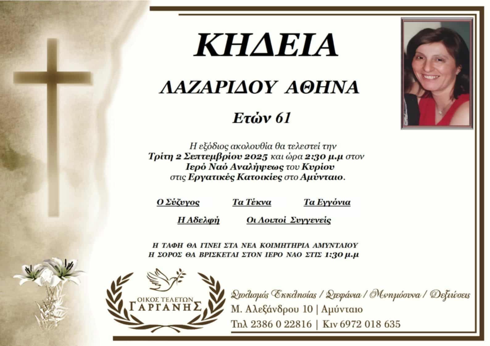 ΚοινωνικάΚηδεία της Αθηνάς Λαζαρίδου, ετών 61 Δευτέρα 1 Σεπτεμβρίου, 2025 20:31 florinapress.gr SHARE Ίσως να ενδιαφέρει ... Κηδεία του Ιωάννη Αφορόζη, ετών 70 Κηδεία της Αλεξάνδρας Μητρούση Κηδεία του Θωμά Δημητρίου Ευχαριστήριο του Βουλευτή Γιάννη Αντωνιάδη Κηδεία της Ελένης Μοριχοβίτου, ετών 81 Share Ακολουθήστε μας8.4kFollowersLikeΤελευταία νέα Αγανακτισμένοι αγρότες : Ως εδώ, η κατάσταση δεν πάει άλλο Κοινωνία Πέμπτη 4 Δεκεμβρίου, 2025 Επισκέψεις Κινητών Μονάδων Υγείας σε απομακρυσμένες Κοινότητες του Δήμου Αμυνταίου Κοινωνία Πέμπτη 4 Δεκεμβρίου, 2025 Ευχαριστήρια επιστολή του Πειραματικού Σχολείου Φλώρινας προς το Κέντρο Περιβαλλοντικής Εκπαίδευσης & Αειφορίας Μελίτης Κοινωνία Πέμπτη 4 Δεκεμβρίου, 2025 Πωλείται Γερμανικός λέβητας ξύλου Κοινωνία Πέμπτη 4 Δεκεμβρίου, 2025
