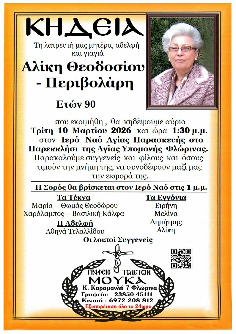 ΚοινωνικάΚηδεία της Αλίκης Θεοδοσίου – Περιβολάρη, ετών 90 Δευτέρα 9 Μαρτίου, 2026 13:00 florinapress.gr SHARE Ίσως να ενδιαφέρει ... Κηδεία της Αλίκης Βερμπελή, ετών 76 Κηδεία της Άννας Σιάγκα, ετών 29 Κηδεία του Φώτη Πιθαρά, ετών 70 Ευχαριστήριο του Πειραματικού Σχολείου Φλώρινας Κηδεία του Νικολάου Μίσσιου, ετών 57 Share Ακολουθήστε μας8.4kFollowersLikeΤελευταία νέα Κηδεία της Ελευθερίας Ιωαννίδου, ετών 77 Κοινωνικά Δευτέρα 9 Μαρτίου, 2026 Στ. Παπασωτηρίου: Πρότυπο ψηφιακής οργάνωσης και ελέγχου το Νοσοκομείο Φλώρινας Πολιτική Δευτέρα 9 Μαρτίου, 2026 Ενημέρωση από τους γιατρούς του Ενιαίου Κοινωνικού Δικτύου Δυτικής Μακεδονίας στο Σχολείο Δεύτερης Ευκαιρίας Φλώρινας Κοινωνία Δευτέρα 9 Μαρτίου, 2026 Την Παγκόσμια ημέρα της Γυναίκας γιόρτασαν οι γυναίκες της Ιτιάς Κοινωνία Πολιτισμός Δευτέρα 9 Μαρτίου, 2026
