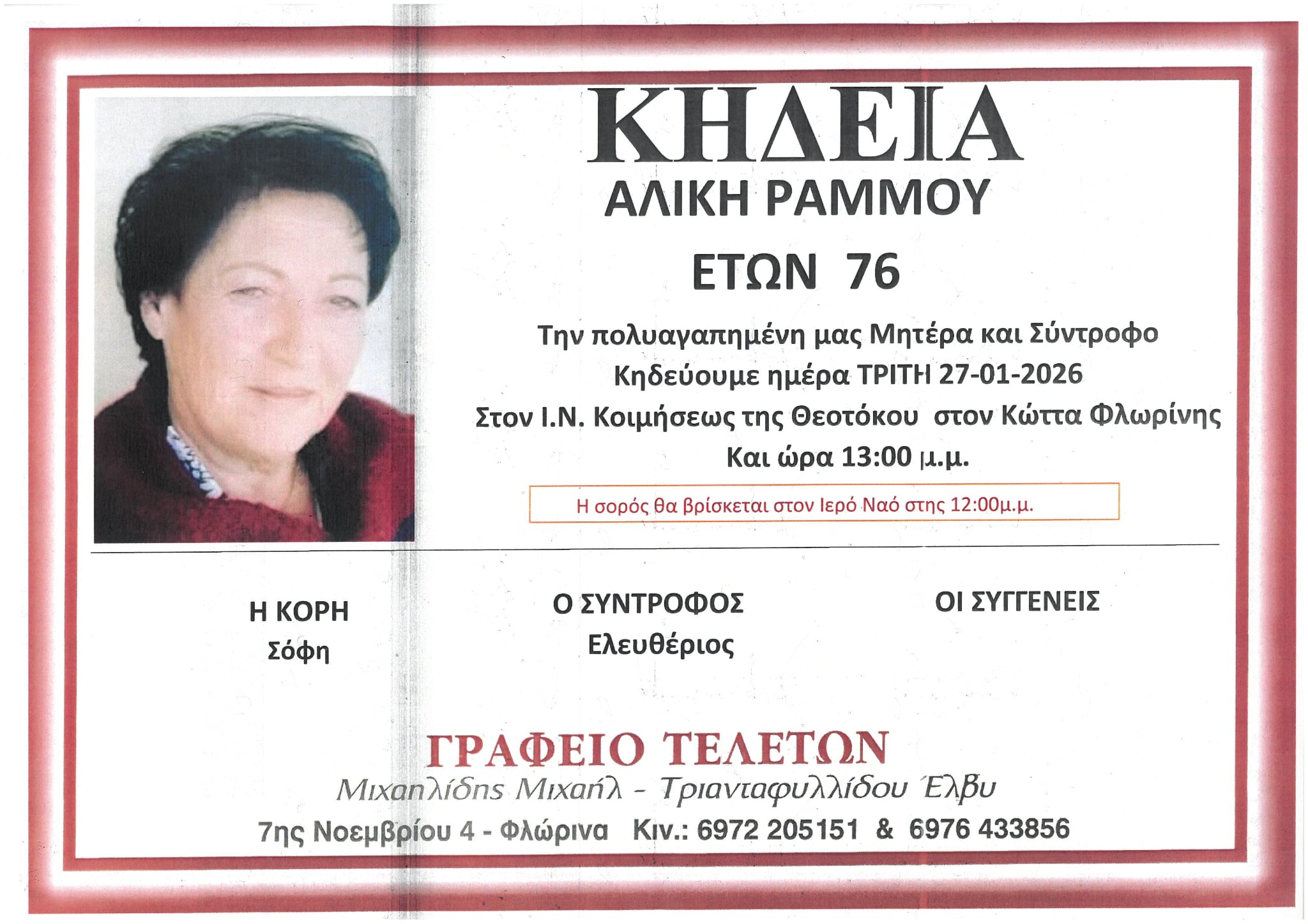 ΚοινωνικάΚηδεία της Αλίκης Ράμμου, ετών 76 Κυριακή 25 Ιανουαρίου, 2026 22:24 florinapress.gr SHARE Ίσως να ενδιαφέρει ... Κηδεία της Παρασκευής (Βούλας) Γαργάνη, ετών 63 Κηδεία της Καλυψούς Πέτρου, ετών 67 Κηδεία του Σταύρου Παρίση, ετών 94 Κηδεία του Αποστόλου Ονούφριου Κηδεία του Δημητρίου Ταουσάνη, ετών 79 Share Ακολουθήστε μας8.4kFollowersLikeΤελευταία νέα ΕΣΑμεΑ: Με βαριά καρδιά και συγκίνηση αποχαιρετούμε τον Μιχάλη Μήγγο Κοινωνία Δευτέρα 26 Ιανουαρίου, 2026 Μαύρη σελίδα για την εργατική τάξη – Η τραγωδία στα Τρίκαλα δεν πρέπει να μείνει ατιμώρητη Κοινωνία Δευτέρα 26 Ιανουαρίου, 2026 Επισκέψεις κινητών ομάδων του ΕΟΔΥ σε Λέχοβο και Σκλήθρο Κοινωνία Δευτέρα 26 Ιανουαρίου, 2026 Πρόγραμμα τηλεκατάρτισης ανέργων – εργαζομένων από τη ΔΥΠΑ Κοινωνία Δευτέρα 26 Ιανουαρίου, 2026