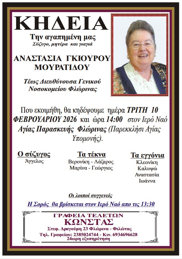 ΚοινωνικάΚηδεία της Αναστασίας Γκιούρου – Μουρατίδου Δευτέρα 9 Φεβρουαρίου, 2026 14:03 florinapress.gr SHARE Ίσως να ενδιαφέρει ... Κηδεία του Γεωργίου Μπραγιάννη, ετών 56 Κηδεία της Αγγελικής Χατζηϊωάννου Κηδεία της Ευαγγελίας Γιτοπούλου, ετών 88 Κηδεία της Σοφίας Δελκούση, ετών 90 Κηδεία του Θεόδωρου Αηδονίδη, ετών 88 Share Ακολουθήστε μας8.4kFollowersLikeΤελευταία νέα Με χρυσό μετάλλιο ξεκίνησαν οι αγωνιστικές υποχρεώσεις για την ομάδα των αλπικών αγωνισμάτων του ΣΟΧ Φλώρινας το Σαββατοκύριακο 7 και 8 Φεβρουαρίου Αθλητισμός Δευτέρα 9 Φεβρουαρίου, 2026 Μήνυμα της Διευθύντριας Πρωτοβάθμιας Εκπαίδευσης Φλώρινας για την Παγκόσμια Ημέρα Ελληνικής Γλώσσας Κοινωνία Δευτέρα 9 Φεβρουαρίου, 2026 Η Βράβευση των Πρωταθλητών και η κοπή Βασιλόπιτας του Ο.ΞΙ.Φ. Αθλητισμός Δευτέρα 9 Φεβρουαρίου, 2026 Συνελήφθησαν 4 ανήλικοι και ένας 18χρονος για πρόκληση σωματικών βλαβών σε βάρος ανηλίκου στη Φλώρινα Κοινωνία Δευτέρα 9 Φεβρουαρίου, 2026