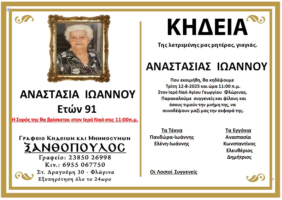 ΚοινωνικάΚηδεία της Αναστασίας Ιωάννου, ετών 91 Τρίτη 12 Αυγούστου, 2025 01:12 florinapress.gr SHARE Ίσως να ενδιαφέρει ... Κηδεία της Φλώρας Τάσιου, ετών 90 Μνημόσυνα Κυριακής 6 Φεβρουαρίου Κηδεία της Αναστασίας Σαλαπάνη, ετών 88 Κηδεία του Αναστασίου Ηλιάδη, ετών 87 Κηδεία της Ευαγγελίας Μίσσου, ετών 73 Share Ακολουθήστε μας8.4kFollowersLikeΤελευταία νέα Αγανακτισμένοι αγρότες : Ως εδώ, η κατάσταση δεν πάει άλλο Κοινωνία Πέμπτη 4 Δεκεμβρίου, 2025 Επισκέψεις Κινητών Μονάδων Υγείας σε απομακρυσμένες Κοινότητες του Δήμου Αμυνταίου Κοινωνία Πέμπτη 4 Δεκεμβρίου, 2025 Ευχαριστήρια επιστολή του Πειραματικού Σχολείου Φλώρινας προς το Κέντρο Περιβαλλοντικής Εκπαίδευσης & Αειφορίας Μελίτης Κοινωνία Πέμπτη 4 Δεκεμβρίου, 2025 Πωλείται Γερμανικός λέβητας ξύλου Κοινωνία Πέμπτη 4 Δεκεμβρίου, 2025