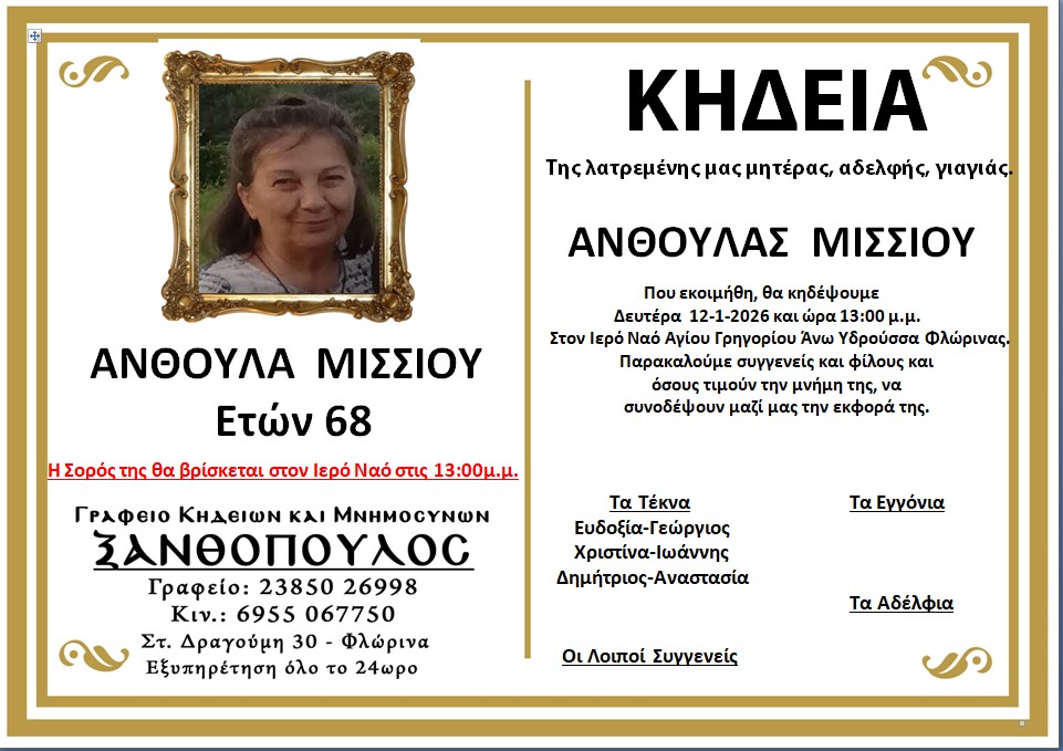 ΚοινωνικάΚηδεία της Ανθούλας Μίσσιου, ετών 68 Κυριακή 11 Ιανουαρίου, 2026 20:50 florinapress.gr SHARE Ίσως να ενδιαφέρει ... Κηδεία του Χαράλαμπου Ταμιάκη Κηδεία της Ελένης Λουκίδου, ετών 91 Κηδεία του Βασιλείου Βράντση, ετών 89 Κηδεία της Σοφίας Αθανασιάδου, ετών 91 Κηδεία της Σοφίας Σιάνου, ετών 79 Share Ακολουθήστε μας8.4kFollowersLikeΤελευταία νέα Δεσμοί Κοινωνία Κυριακή 11 Ιανουαρίου, 2026 Ευχαριστήριο για τη δωρεά πίνακα ζωγραφικής Πολιτισμός Κυριακή 11 Ιανουαρίου, 2026 Απάντηση του Δήμου Αμυνταίου σε δημοσιεύματα σχετικά με τη λειτουργία των σχολικών μονάδων Πολιτική Κυριακή 11 Ιανουαρίου, 2026 Σταύρος Παπασωτηρίου: «ΠΑΣΟΚ – Ανδρουλάκης βυθίζονται στα λάθη και την άγνοια» Πολιτική Κυριακή 11 Ιανουαρίου, 2026