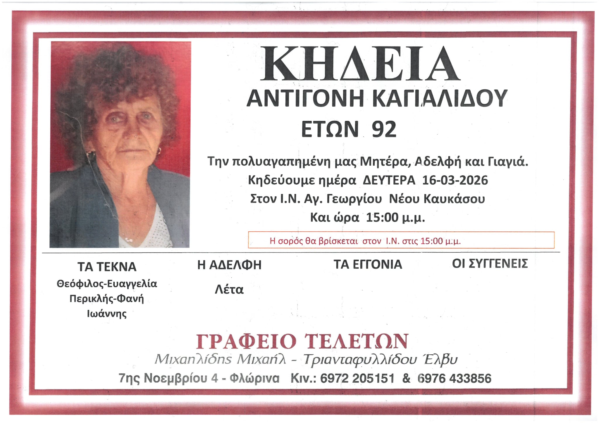 ΚοινωνικάΚηδεία της Αντιγόνης Καγιαλίδου, ετών 92 Κυριακή 15 Μαρτίου, 2026 18:59 florinapress.gr SHARE Ίσως να ενδιαφέρει ... Κηδεία της Γεωργίας Σεβαστοπούλου, ετών 87 Κηδεία του Γεωργίου Μπούτουλα, ετών 50 Κηδεία της Μαγδαληνής Δημοπούλου, ετών 89 Κηδεία του Τραϊανού Κώτσιου, ετών 77 Κηδεία του Δημητρίου Μητσκόπουλου Share Ακολουθήστε μας8.4kFollowersLikeΤελευταία νέα Κηδεία του Γεωργίου Θεοφανίδη, ετών 91 Κοινωνικά Κυριακή 15 Μαρτίου, 2026 Συγχαρητήριο μήνυμα του 1ου ΕΠΑΛ Φλώρινας Κοινωνία Κυριακή 15 Μαρτίου, 2026 Κηδεία της Σταυρούλας Μάγγου, ετών 85 Κοινωνικά Κυριακή 15 Μαρτίου, 2026 Ευχαριστήριο του 3ου Γυμνασίου Φλώρινας προς το εργοστάσιο παραγωγής αναψυκτικών Ιτέα Φλώρινας Κοινωνία Κυριακή 15 Μαρτίου, 2026