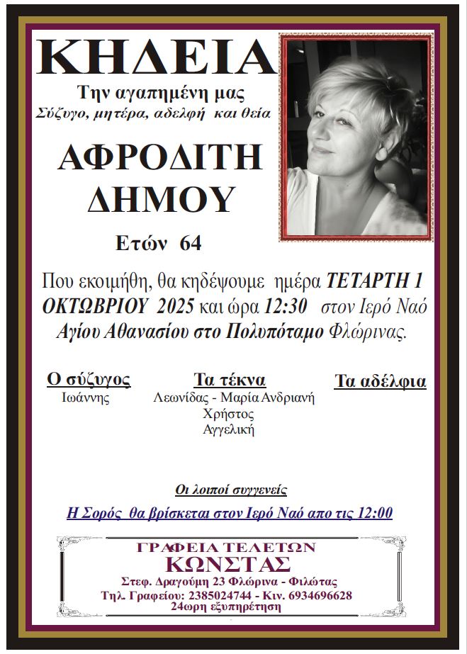 ΚοινωνικάΚηδεία της Αφροδίτης Δήμου ετών 64 Τρίτη 30 Σεπτεμβρίου, 2025 09:43 florinapress.gr SHARE Ίσως να ενδιαφέρει ... Κηδεία του Ιωάννη Αλεξίου Κηδεία της Ευαγγελής Παπαναστασίου Συλλυπητήριο του ΣΥΡΙΖΑ Φλώρινας για την απώλεια του Νίκου Κοντοσώρου Κηδεία του Αναστασίου Μπούτσικου, ετών 75 Ψήφισμα Share Ακολουθήστε μας8.4kFollowersLikeΤελευταία νέα Αγανακτισμένοι αγρότες : Ως εδώ, η κατάσταση δεν πάει άλλο Κοινωνία Πέμπτη 4 Δεκεμβρίου, 2025 Επισκέψεις Κινητών Μονάδων Υγείας σε απομακρυσμένες Κοινότητες του Δήμου Αμυνταίου Κοινωνία Πέμπτη 4 Δεκεμβρίου, 2025 Ευχαριστήρια επιστολή του Πειραματικού Σχολείου Φλώρινας προς το Κέντρο Περιβαλλοντικής Εκπαίδευσης & Αειφορίας Μελίτης Κοινωνία Πέμπτη 4 Δεκεμβρίου, 2025 Πωλείται Γερμανικός λέβητας ξύλου Κοινωνία Πέμπτη 4 Δεκεμβρίου, 2025