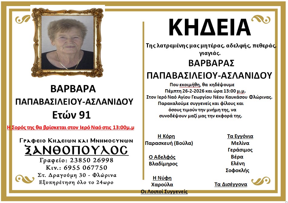ΚοινωνικάΚηδεία της Βαρβάρας Παπαβασιλείου – Ασλανίδου, ετών 91 Τετάρτη 25 Φεβρουαρίου, 2026 13:00 florinapress.gr SHARE Ίσως να ενδιαφέρει ... Κηδεία του Σιδέρη Κώτσου Κηδεία του Αριστείδη Θωμαϊδη, ετών 80 Συγχαρητήρια επιστολή της Ένωσης Αστυνομικών Υπαλλήλων φλώρινας Κηδεία του Βύρωνα Ζέρβα, ετών 93 Ο «Αριστοτέλης» ευχαριστεί Share Ακολουθήστε μας8.4kFollowersLikeΤελευταία νέα Κάλεσμα του σωματείου οδηγών αυτοκινήτων Φλώρινας για το συλλαλητήριο του Σαββάτου στις 17:00 Κοινωνία Τετάρτη 25 Φεβρουαρίου, 2026 Κινηματογραφικές προβολές της Λέσχης Πολιτισμού Φλώρινας Πολιτισμός Τετάρτη 25 Φεβρουαρίου, 2026 Το Σωματείο Καθαριστών & Καθαριστριών συμμετέχει στο συλλαλητήριο για τα Τέμπη το Σάββατο στις 17:00 Κοινωνία Τετάρτη 25 Φεβρουαρίου, 2026 Το Σωματείο Εργαζομένων στα Λιγνιτωρυχεία Αχλάδας συμμετέχει στο συλλαλητήριο για τα Τέμπη το Σάββατο στις 17:00 Κοινωνία Τετάρτη 25 Φεβρουαρίου, 2026