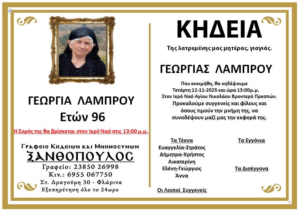 ΚοινωνικάΚηδεία της Γεωργίας Λάμπρου, ετών 94 Τρίτη 11 Νοεμβρίου, 2025 15:09 florinapress.gr SHARE Ίσως να ενδιαφέρει ... Κηδεία του Βύρωνα Λιούλιου, ετών 81 Κηδεία της Αφροδίτης Δήμου ετών 64 Τεσσαρακονθήμερο μνημόσυνο του Νικολάου Δόντσου Κηδεία της Αθηνάς Κομματά, ετών 78 Κηδεία του Δημητρίου Παπαδίνη, ετών 66 Share Ακολουθήστε μας8.4kFollowersLikeΤελευταία νέα Αγανακτισμένοι αγρότες : Ως εδώ, η κατάσταση δεν πάει άλλο Κοινωνία Πέμπτη 4 Δεκεμβρίου, 2025 Επισκέψεις Κινητών Μονάδων Υγείας σε απομακρυσμένες Κοινότητες του Δήμου Αμυνταίου Κοινωνία Πέμπτη 4 Δεκεμβρίου, 2025 Ευχαριστήρια επιστολή του Πειραματικού Σχολείου Φλώρινας προς το Κέντρο Περιβαλλοντικής Εκπαίδευσης & Αειφορίας Μελίτης Κοινωνία Πέμπτη 4 Δεκεμβρίου, 2025 Πωλείται Γερμανικός λέβητας ξύλου Κοινωνία Πέμπτη 4 Δεκεμβρίου, 2025