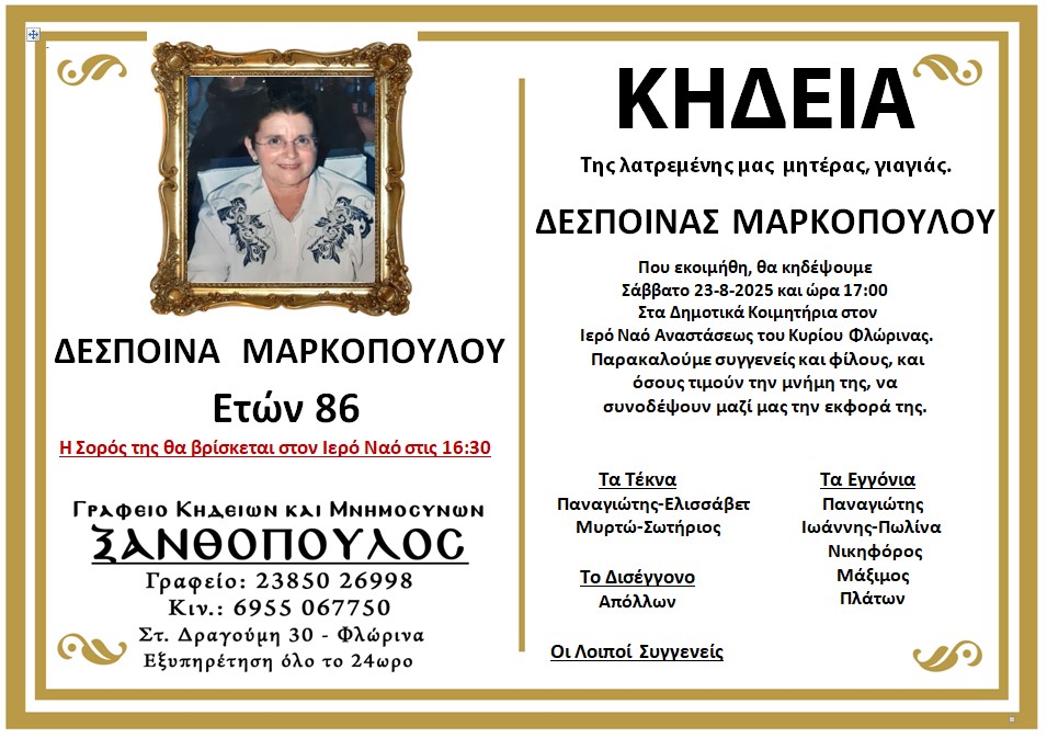 ΚοινωνικάΚηδεία της Δέσποινας Μαρκοπούλου, ετών 86 Σάββατο 23 Αυγούστου, 2025 11:57 florinapress.gr SHARE Ίσως να ενδιαφέρει ... Κηδεία του Κωνσταντίνου Καλαϊτζή, ετών 92 Κηδεία του Γεωργίου Γκίνη, ετών 65 Κηδεία του Μιχαήλ Χριστιανόπουλου, ετών 98 Κηδεία του Μιλτιάδη Μπαρδάκα, ετών 86 Κηδεία του Τριαντάφυλλου Παπαϊωάννου Share Ακολουθήστε μας8.4kFollowersLikeΤελευταία νέα Αγανακτισμένοι αγρότες : Ως εδώ, η κατάσταση δεν πάει άλλο Κοινωνία Πέμπτη 4 Δεκεμβρίου, 2025 Επισκέψεις Κινητών Μονάδων Υγείας σε απομακρυσμένες Κοινότητες του Δήμου Αμυνταίου Κοινωνία Πέμπτη 4 Δεκεμβρίου, 2025 Ευχαριστήρια επιστολή του Πειραματικού Σχολείου Φλώρινας προς το Κέντρο Περιβαλλοντικής Εκπαίδευσης & Αειφορίας Μελίτης Κοινωνία Πέμπτη 4 Δεκεμβρίου, 2025 Πωλείται Γερμανικός λέβητας ξύλου Κοινωνία Πέμπτη 4 Δεκεμβρίου, 2025
