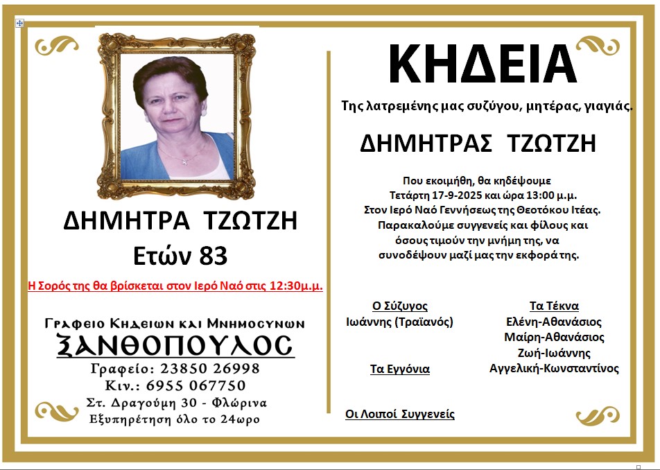 ΚοινωνικάΚηδεία της Δήμητρας Τζώτζη, ετών 83 Τρίτη 16 Σεπτεμβρίου, 2025 12:41 florinapress.gr SHARE Ίσως να ενδιαφέρει ... Κηδεία της Ζωής Κοΐδου, ετών 88 Κηδεία της Βασιλικής Πάτκα, ετών 93 Κηδεία της Ευτυχίας Τσιλιγκαρίδου, ετών 82 Κηδεία του Δημητρίου Γαλή Ευχαριστήριο του Εκκλησιαστικού Γηροκομείου της Ιεράς Μητροπόλεως Φλωρίνης Share Ακολουθήστε μας8.4kFollowersLikeΤελευταία νέα Την Τετάρτη 10 Δεκεμβρίου η φωταγώγηση του Χριστουγεννιάτικου Δέντρου στην κεντρική πλατεία της Φλώρινας Εκδηλώσεις Πολιτισμός Παρασκευή 5 Δεκεμβρίου, 2025 Χριστουγεννιάτικη συναυλία της Φιλαρμονικής Δήμου Φλώρινας Εκδηλώσεις Πολιτισμός Παρασκευή 5 Δεκεμβρίου, 2025 Η νέα σύνθεση της Δημοτικής Τοπικής Οργάνωσης (ΔΗΜΤΟ) Νέας Δημοκρατίας Αμυνταίου Πολιτική Παρασκευή 5 Δεκεμβρίου, 2025 Μήνυμα του Δημάρχου Φλώρινας για την Παγκόσμια Ημέρα Εθελοντισμού Κοινωνία Πολιτική Παρασκευή 5 Δεκεμβρίου, 2025