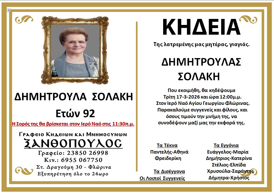 ΚοινωνικάΚηδεία της Δημητρούλας Σολάκη, ετών 92 Δευτέρα 16 Μαρτίου, 2026 19:48 florinapress.gr SHARE Ίσως να ενδιαφέρει ... Συλλυπητήριο μήνυμα της Βουλευτή ΣΥΡΙΖΑ-ΠΣ Φλώρινας Π. Πέρκα για την εκδημία της Μ. Μπίρου-Παπουτζή Κηδεία της Ασημούλας Κοσμίδου, ετών 83 Κηδεία του Ιωάννη Ασμάνη, ετών 92 Κηδεία της Ευαγγελίας Λουκά, ετών 75 Κηδεία του Κωνσταντίνου Ιωαννίδη Share Ακολουθήστε μας8.4kFollowersLikeΤελευταία νέα Τα αποτελέσματα των εκλογών στην ΟΝΝΕΔ Φλώρινας Πολιτική Δευτέρα 16 Μαρτίου, 2026 Ευχαριστήριο για τη συμμετοχή στις εκλογές ανάδειξης συνέδρων του ΠΑΣΟΚ στον Ν. Φλώρινας Πολιτική Δευτέρα 16 Μαρτίου, 2026 Δωρεάν υγειονομικές εξετάσεις για τους κατοίκους της Δημοτικής Κοινότητας Κέλλης Κοινωνία Δευτέρα 16 Μαρτίου, 2026 Ποδοσφαιρικό διήμερο για τις Ελπίδες Φλώρινας Αθλητισμός Δευτέρα 16 Μαρτίου, 2026