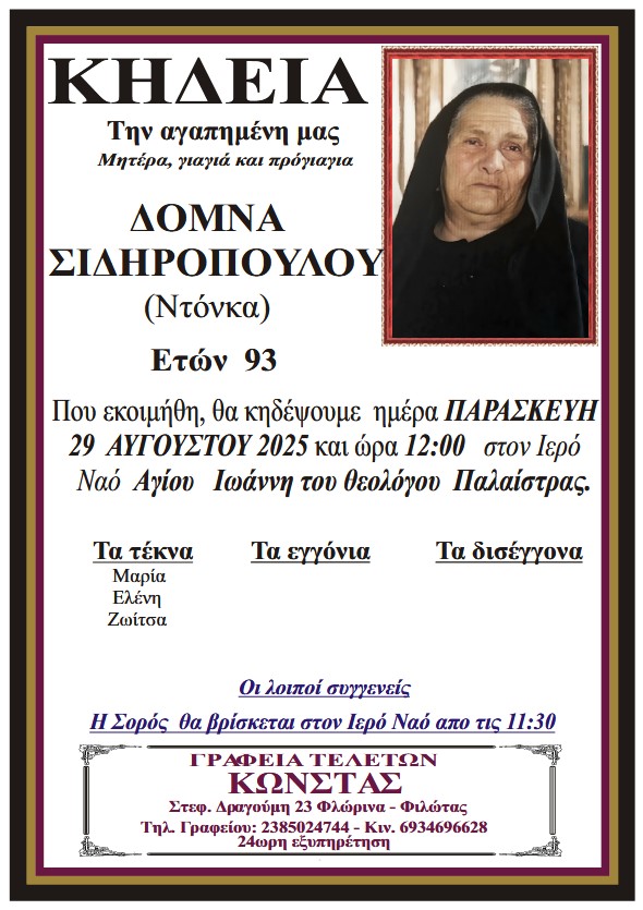 ΚοινωνικάΚηδεία της Δόμνας Σιδηροπούλου, ετών 93 Πέμπτη 28 Αυγούστου, 2025 20:15 florinapress.gr SHARE Ίσως να ενδιαφέρει ... Συλλυπητήριο του Συλλόγου Διδασκόντων του 2ου Δημοτικού Σχολείου Κηδεία της Ελένης Μητσκοπούλου, ετών 77 Κηδεία της Αναστασίας Ντέμου ετών 85 Κηδεία της Μαρίας Γουσοπούλου – Νικέζη, ετών 75 Τεσσαρακονθήμερο μνημόσυνο της Ευφροσύνης Λαζαρίδου Share Ακολουθήστε μας8.4kFollowersLikeΤελευταία νέα Την Τετάρτη 10 Δεκεμβρίου η φωταγώγηση του Χριστουγεννιάτικου Δέντρου στην κεντρική πλατεία της Φλώρινας Εκδηλώσεις Πολιτισμός Παρασκευή 5 Δεκεμβρίου, 2025 Χριστουγεννιάτικη συναυλία της Φιλαρμονικής Δήμου Φλώρινας Εκδηλώσεις Πολιτισμός Παρασκευή 5 Δεκεμβρίου, 2025 Η νέα σύνθεση της Δημοτικής Τοπικής Οργάνωσης (ΔΗΜΤΟ) Νέας Δημοκρατίας Αμυνταίου Πολιτική Παρασκευή 5 Δεκεμβρίου, 2025 Μήνυμα του Δημάρχου Φλώρινας για την Παγκόσμια Ημέρα Εθελοντισμού Κοινωνία Πολιτική Παρασκευή 5 Δεκεμβρίου, 2025