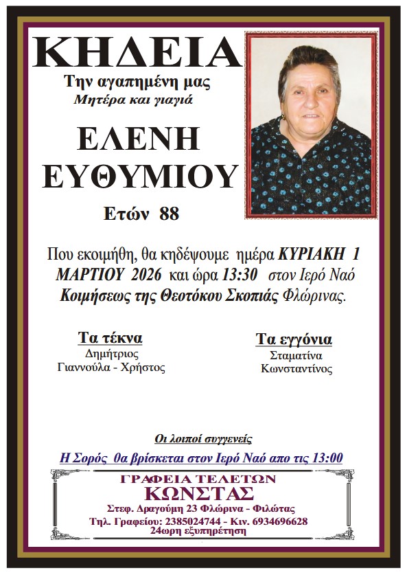 ΚοινωνικάΚηδεία της Ελένης Ευθυμίου, ετών 88 Σάββατο 28 Φεβρουαρίου, 2026 21:06 florinapress.gr SHARE Ίσως να ενδιαφέρει ... Κηδεία του Κωνσταντίνου Γουρζουλίδη, ετών 60 Ψήφισμα του 3ου Γυμνασίου Φλώρινας Κηδεία του Αναστασίου Κοϊδη Κηδεία του Παντελή Παπαϊωάννου Κηδεία του Παντελή Τζώτζη, ετών 86 Share Ακολουθήστε μας8.4kFollowersLikeΤελευταία νέα Συλλαλητήρια για τα Τέμπη στη Φλώρινα Κοινωνία Σάββατο 28 Φεβρουαρίου, 2026 Σχολή Διαιτησίας στη Φλώρινα Αθλητισμός Σάββατο 28 Φεβρουαρίου, 2026 Μήνυμα Δημάρχου Αμυνταίου για τα τρία χρόνια από το δυστύχημα των Τεμπών Πολιτική Σάββατο 28 Φεβρουαρίου, 2026 Συνελήφθη 28χρονη αλλοδαπή σε περιοχή της Φλώρινας Κοινωνία Σάββατο 28 Φεβρουαρίου, 2026