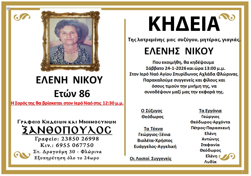 ΚοινωνικάΚηδεία της Ελένης Νίκου, ετών 86 Παρασκευή 23 Ιανουαρίου, 2026 12:35 florinapress.gr SHARE Ίσως να ενδιαφέρει ... Κηδεία του Γεωργίου Αλαμπάκη, ετών 94 Ψήφισμα του Διοικητικού Συμβουλίου του Επιμελητηρίου Φλώρινας Ετήσιο μνημόσυνο του Ιορδάνη Ατματζίδη Κηδεία της Πετρούλας Κωτσελίδου, ετών 86 Κηδεία του Τραϊανού Παπουτζή Share Ακολουθήστε μας8.4kFollowersLikeΤελευταία νέα Η καλή είδηση της ημέρας: Πνοή ανάπτυξης και ασφάλειας στο Αμύνταιο με τη μεταστάθμευση νέων μονάδων Πολιτική Παρασκευή 23 Ιανουαρίου, 2026 Θέση Εργασίας Πρακτορείο ΟΠΑΠ Το 6αρι Μάργαρης Κωνσταντίνος Κοινωνία Παρασκευή 23 Ιανουαρίου, 2026 Ερώτηση Βουλευτών της Νέας Αριστεράς: «Να στηρίξει με χρηματοδότηση τις ενεργειακές κοινότητες η κυβέρνηση» Πολιτική Παρασκευή 23 Ιανουαρίου, 2026 Υπενθύμιση έκδοσης Άδειας Κατάληψης Κοινόχρηστου Χώρου έτους 2026 Πολιτική Παρασκευή 23 Ιανουαρίου, 2026