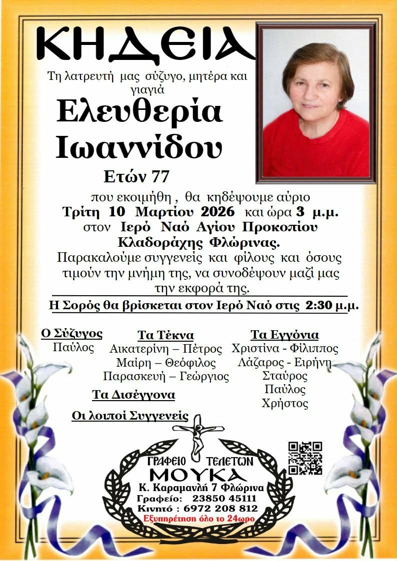 ΚοινωνικάΚηδεία της Ελευθερίας Ιωαννίδου, ετών 77 Δευτέρα 9 Μαρτίου, 2026 20:01 florinapress.gr SHARE Ίσως να ενδιαφέρει ... Κηδεία του Λάζαρου Πάτκα ετών 93 Κηδεία του Χαράλαμπου Ταρτόρα, ετών 38 Κηδεία του Στέφανου Αντωνιάδη Συγχαρητήριο μήνυμα του Α.Π.Σ. “SHOGUN” Κηδεία του Ιωάννη Μαυρουδή, ετών 62 Share Ακολουθήστε μας8.4kFollowersLikeΤελευταία νέα Κηδεία του Μιχαήλ Μάγγου, ετών 85 Κοινωνικά Δευτέρα 9 Μαρτίου, 2026 Ευχαριστήριο του 1ου ΕΠΑΛ Φλώρινας προς τη Διατροφολόγο – Διαιτολόγο Μαρία Γιώση Κοινωνία Δευτέρα 9 Μαρτίου, 2026 Στο γήπεδο της Μελίτης αγωνίστηκαν οι Ελπίδες Φλώρινας το Σάββατο 7/3 Αθλητισμός Δευτέρα 9 Μαρτίου, 2026 Χάντμπολ: Πάλεψε αλλά λύγισε στο τέλος ο Αμύντας – Ζωντανός στη μάχη της παραμονής Αθλητισμός Δευτέρα 9 Μαρτίου, 2026