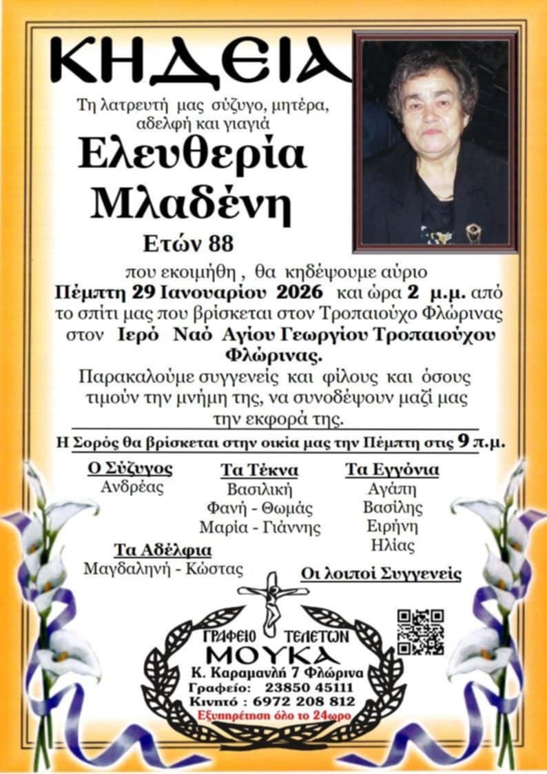 ΚοινωνικάΚηδεία της Ελευθερίας Μλαδένη, ετών 88 Τετάρτη 28 Ιανουαρίου, 2026 20:49 florinapress.gr SHARE Ίσως να ενδιαφέρει ... Κηδεία της Σταυρούλας Χατζή Κηδεία του Τραϊανού Τουρούντζη, ετών 79 Μνημόσυνα Σαββάτου 28 και Κυριακής 29 Δεκεμβρίου Κηδεία της Αρχόντας Παπαγεωργίου, ετών 82 Κηδεία της Χρυσούλας Μαυρουδή, ετών 84 Share Ακολουθήστε μας8.4kFollowersLikeΤελευταία νέα Προβληματισμοί αναγνώστη – πολίτη της Φλώρινας Κοινωνία Τετάρτη 28 Ιανουαρίου, 2026 Η Κική Τσακαλδήμη τα κατάφερε: κατέκτησε την κορυφή του Ακονκάγκουα – Το θερμό ευχαριστώ στον Γρηγόρη Δημητριάδη Αθλητισμός Πολιτική Τετάρτη 28 Ιανουαρίου, 2026 Κηδεία της Σοφίας Μαυρίδου ετών 79 Κοινωνικά Τετάρτη 28 Ιανουαρίου, 2026 Εγκρίθηκε το Περιφερειακό Πρόγραμμα Ανάπτυξης (Π.Π.Α) Δυτικής Μακεδονίας Πολιτική Τετάρτη 28 Ιανουαρίου, 2026