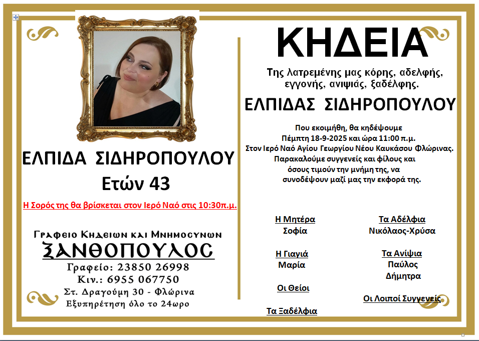 ΚοινωνικάΚηδεία της Ελπίδας Σιδηροπούλου, ετών 43 Τετάρτη 17 Σεπτεμβρίου, 2025 10:30 florinapress.gr SHARE Ίσως να ενδιαφέρει ... Μνημόσυνα Σαββάτου 24 Ιουλίου Κηδεία της Άννας Παπαδημητρίου Κηδεία της Φωτεινής Οπασίνη Κηδεία της Σταυρούλας Γιαννακοπούλου – Κώνστα, ετών 81 Κηδεία της Πανδώρας Μαύρου – Κροκαρόπουλου ετών 63 Share Ακολουθήστε μας8.4kFollowersLikeΤελευταία νέα Αγανακτισμένοι αγρότες : Ως εδώ, η κατάσταση δεν πάει άλλο Κοινωνία Πέμπτη 4 Δεκεμβρίου, 2025 Επισκέψεις Κινητών Μονάδων Υγείας σε απομακρυσμένες Κοινότητες του Δήμου Αμυνταίου Κοινωνία Πέμπτη 4 Δεκεμβρίου, 2025 Ευχαριστήρια επιστολή του Πειραματικού Σχολείου Φλώρινας προς το Κέντρο Περιβαλλοντικής Εκπαίδευσης & Αειφορίας Μελίτης Κοινωνία Πέμπτη 4 Δεκεμβρίου, 2025 Πωλείται Γερμανικός λέβητας ξύλου Κοινωνία Πέμπτη 4 Δεκεμβρίου, 2025