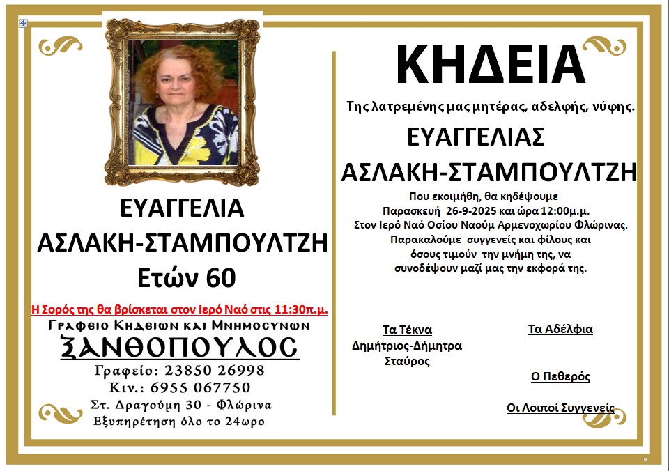 ΚοινωνικάΚηδεία της Ευαγγελίας Ασλάκη-Σταμπουλτζή ετών 60 Πέμπτη 25 Σεπτεμβρίου, 2025 13:10 florinapress.gr SHARE Ίσως να ενδιαφέρει ... Κηδεία της Αννας Κρέστου Εκκρεμές Κηδεία του Γεωργίου Σταμπουλίδη, ετών 82 Συστράτευση, Γενναιότητα, Υπευθυνότητα, Αλήθεια Πρόγραμμα εκδηλώσεων στην πόλη της Φλώρινας για την ημέρα μνήμης της γενοκτονίας των Ελλήνων της Μ. Ασίας από το τούρκικο κράτος Share Ακολουθήστε μας8.4kFollowersLikeΤελευταία νέα Αγανακτισμένοι αγρότες : Ως εδώ, η κατάσταση δεν πάει άλλο Κοινωνία Πέμπτη 4 Δεκεμβρίου, 2025 Επισκέψεις Κινητών Μονάδων Υγείας σε απομακρυσμένες Κοινότητες του Δήμου Αμυνταίου Κοινωνία Πέμπτη 4 Δεκεμβρίου, 2025 Ευχαριστήρια επιστολή του Πειραματικού Σχολείου Φλώρινας προς το Κέντρο Περιβαλλοντικής Εκπαίδευσης & Αειφορίας Μελίτης Κοινωνία Πέμπτη 4 Δεκεμβρίου, 2025 Πωλείται Γερμανικός λέβητας ξύλου Κοινωνία Πέμπτη 4 Δεκεμβρίου, 2025