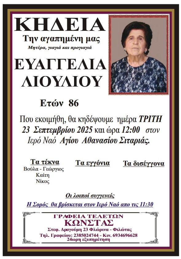 ΚοινωνικάΚηδεία της Ευαγγελίας Λιούλιου, ετών 86 Δευτέρα 22 Σεπτεμβρίου, 2025 13:50 florinapress.gr SHARE Ίσως να ενδιαφέρει ... Κηδεία της Ανδρονίκης Μιμιλίδου – Ασίκη Κηδεία του Βασιλείου Παπά, ετών 73 Κηδεία του Ευάγγελου Θεοφανίδη Κηδεία της Ευτυχίας Θεοδωρίδου Κηδεία της Σοφίας Κατικαρίδου, ετών 87 Share Ακολουθήστε μας8.4kFollowersLikeΤελευταία νέα Αγανακτισμένοι αγρότες : Ως εδώ, η κατάσταση δεν πάει άλλο Κοινωνία Πέμπτη 4 Δεκεμβρίου, 2025 Επισκέψεις Κινητών Μονάδων Υγείας σε απομακρυσμένες Κοινότητες του Δήμου Αμυνταίου Κοινωνία Πέμπτη 4 Δεκεμβρίου, 2025 Ευχαριστήρια επιστολή του Πειραματικού Σχολείου Φλώρινας προς το Κέντρο Περιβαλλοντικής Εκπαίδευσης & Αειφορίας Μελίτης Κοινωνία Πέμπτη 4 Δεκεμβρίου, 2025 Πωλείται Γερμανικός λέβητας ξύλου Κοινωνία Πέμπτη 4 Δεκεμβρίου, 2025