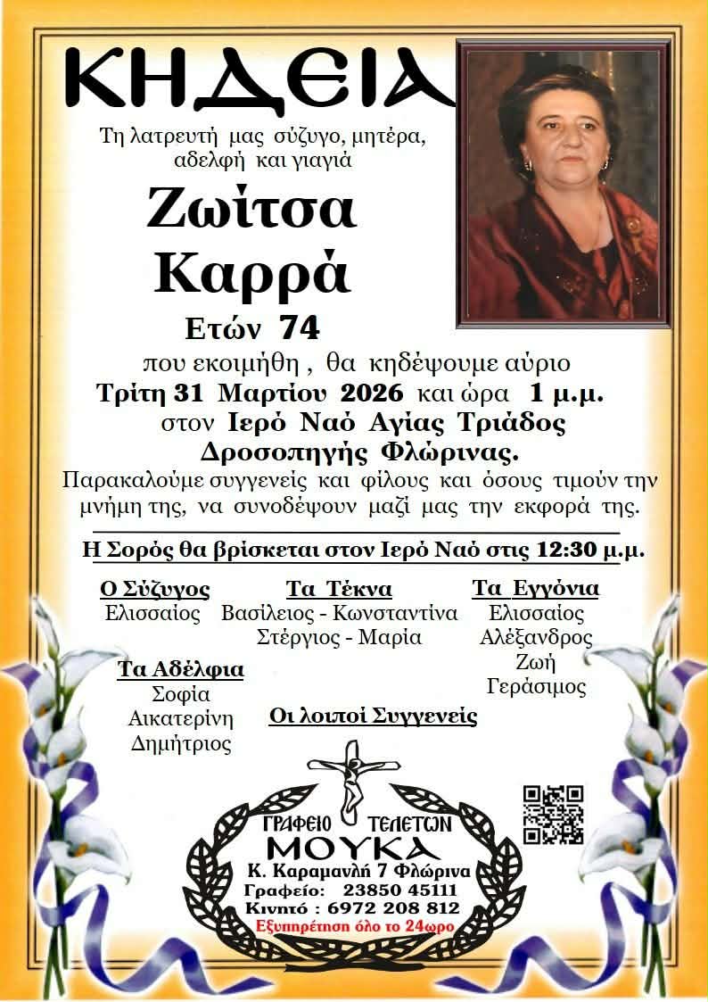 ΚοινωνικάΚηδεία της Ζωίτσας Καρρά, ετών 74 Δευτέρα 30 Μαρτίου, 2026 13:55 florinapress.gr SHARE Ίσως να ενδιαφέρει ... Κηδεία της Αγάπης Μίνου – Ποντίκη, ετών 61 Κηδεία της Ειρήνης Γιασημακοπούλου Ευχαριστήριο του Δημοτικού Σχολείου Μελίτης Κηδεία της Αννέτας Κουσίδου Κηδεία της Μαρίας Παράσχου Share Ακολουθήστε μας8.4kFollowersLikeΤελευταία νέα Κηδεία της Χρυσάνθης Γαζέα, ετών 70 Κοινωνικά Δευτέρα 30 Μαρτίου, 2026 Οι αποφάσεις της τελευταίας συνεδρίασης του Δημοτικού Συμβουλίου Φλώρινας Πολιτική Δευτέρα 30 Μαρτίου, 2026 ΣΟΧ Φλώρινας: 1η η Ιωάννα, 3η η Κατερίνα, 4ος ο Βασίλης Αθλητισμός Δευτέρα 30 Μαρτίου, 2026 Το Εσπερινό Γυμνάσιο- Λύκειο Φλώρινας στο 1ο μαθητικό Συνέδριο Τοπικής Ιστορίας Κοινωνία Δευτέρα 30 Μαρτίου, 2026
