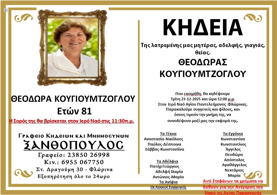 ΚοινωνικάΚηδεία της Θεοδώρας Κουγιουμτζόγλου, ετών 81 Δευτέρα 22 Δεκεμβρίου, 2025 11:10 florinapress.gr SHARE Ίσως να ενδιαφέρει ... Η ΝΟΔΕ Φλώρινας συγχαίρει όλους τους υποψήφιους βουλευτές της Ν.Δ. στην Π.Ε. Φλώρινας Ψήφισμα του 3ου Γυμνασίου Φλώρινας Κηδεία της Αικατερίνης Νικολάου, ετών 96 Κηδεία του Δημητρίου Γιοφτσίδη, ετών 48 Συλλυπητήριο μήνυμα του τμήματος καλαθοσφαίρισης του Φ.Σ.Φ. ‘Ο APIΣTOTEΛHΣ’ Share Ακολουθήστε μας8.4kFollowersLikeΤελευταία νέα Φωτιά σε διαμέρισμα πολυκατοικίας στη Φλώρινα Κοινωνία Δευτέρα 22 Δεκεμβρίου, 2025 Η Χριστουγεννιάτικη Χορωδιακή Συναυλία στον «Αριστοτέλη» Εκδηλώσεις Πολιτισμός Κυριακή 21 Δεκεμβρίου, 2025 Η εκδήλωση «Από μια συμπεριληπτική εκπαίδευση για μια κοινωνία χωρίς αποκλεισμούς» Εκδηλώσεις Πολιτισμός Κυριακή 21 Δεκεμβρίου, 2025 Με μεγάλη επιτυχία πραγματοποιήθηκε η ενημερωτική εκδήλωση για την οστεοπόρωση στον Δήμο Αμυνταίου Εκδηλώσεις Πολιτισμός Κυριακή 21 Δεκεμβρίου, 2025