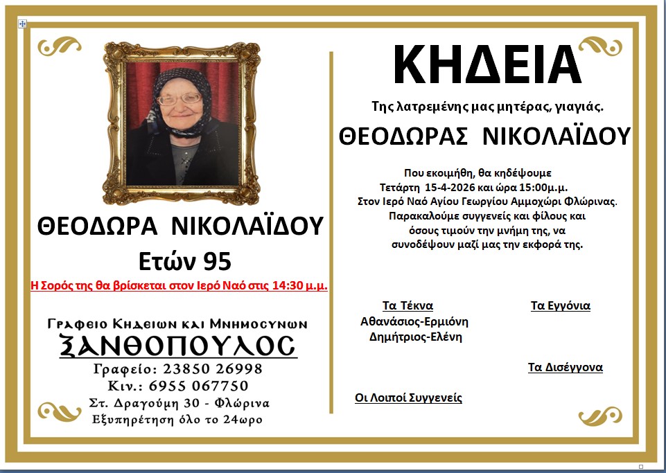 ΚοινωνικάΚηδεία της Θεοδώρας Νικολαϊδου, ετών 95 Τετάρτη 15 Απριλίου, 2026 11:37 florinapress.gr SHARE Ίσως να ενδιαφέρει ... Κηδεία της Αρχόντας Ιωάννου, ετών 86 Τεσσαρακονθήμερο μνημόσυνο της Γεωργίας Δογούλη Κηδεία του Βασιλείου Δημόπουλου Κηδεία της Ειρήνης Τσαρτσιταλίδου, ετών 86 Κηδεία του Ευαγγέλου Κούρτη, ετών 91 Share Ακολουθήστε μας8.4kFollowersLikeΤελευταία νέα Συλλυπητήριο μήνυμα του Δημοτικού Συμβουλίου Φλώρινας Κοινωνία Πολιτική Τετάρτη 15 Απριλίου, 2026 Συλλυπητήριο μήνυμα του Δημάρχου Φλώρινας Κοινωνία Πολιτική Τετάρτη 15 Απριλίου, 2026 Εύξεινος Λέσχη Φλώρινας: «Όλοι μαζί για τον Δημήτρη» Κοινωνία Τετάρτη 15 Απριλίου, 2026 Κηδεία του Νικολάου Γιαννακόπουλου, ετών 83 Κοινωνικά Τετάρτη 15 Απριλίου, 2026