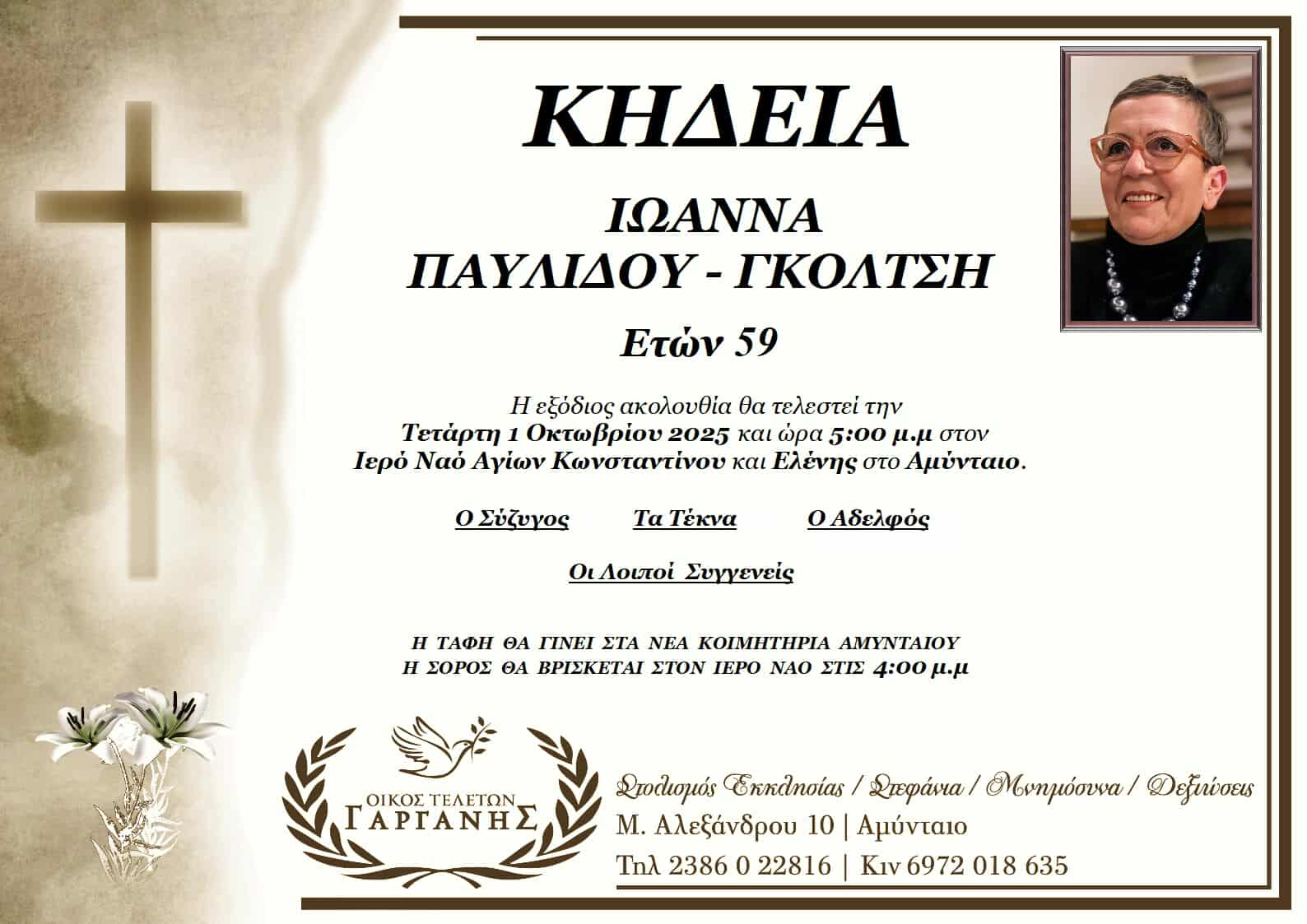 ΚοινωνικάΚηδεία της Ιωάννας Παυλίδου – Γκόλτση, ετών 59 Τρίτη 30 Σεπτεμβρίου, 2025 22:17 florinapress.gr SHARE Ίσως να ενδιαφέρει ... Κηδεία του Θωμά Παναγιωτίδη, ετών 85 Ευχαριστήριο του Σχολείου Δεύτερης Ευκαιρίας Φλώρινας και του Παραρτήματος Αμυνταίου Κηδεία του Χρήστου Παπαστεφάνου, ετών 59 Κηδεία της Ελεονώρας Βάσσιου, ετών 90 Ετήσιο μνημόσυνο του Χρηστίδη Αναστασίου Share Ακολουθήστε μας8.4kFollowersLikeΤελευταία νέα Αγανακτισμένοι αγρότες : Ως εδώ, η κατάσταση δεν πάει άλλο Κοινωνία Πέμπτη 4 Δεκεμβρίου, 2025 Επισκέψεις Κινητών Μονάδων Υγείας σε απομακρυσμένες Κοινότητες του Δήμου Αμυνταίου Κοινωνία Πέμπτη 4 Δεκεμβρίου, 2025 Ευχαριστήρια επιστολή του Πειραματικού Σχολείου Φλώρινας προς το Κέντρο Περιβαλλοντικής Εκπαίδευσης & Αειφορίας Μελίτης Κοινωνία Πέμπτη 4 Δεκεμβρίου, 2025 Πωλείται Γερμανικός λέβητας ξύλου Κοινωνία Πέμπτη 4 Δεκεμβρίου, 2025
