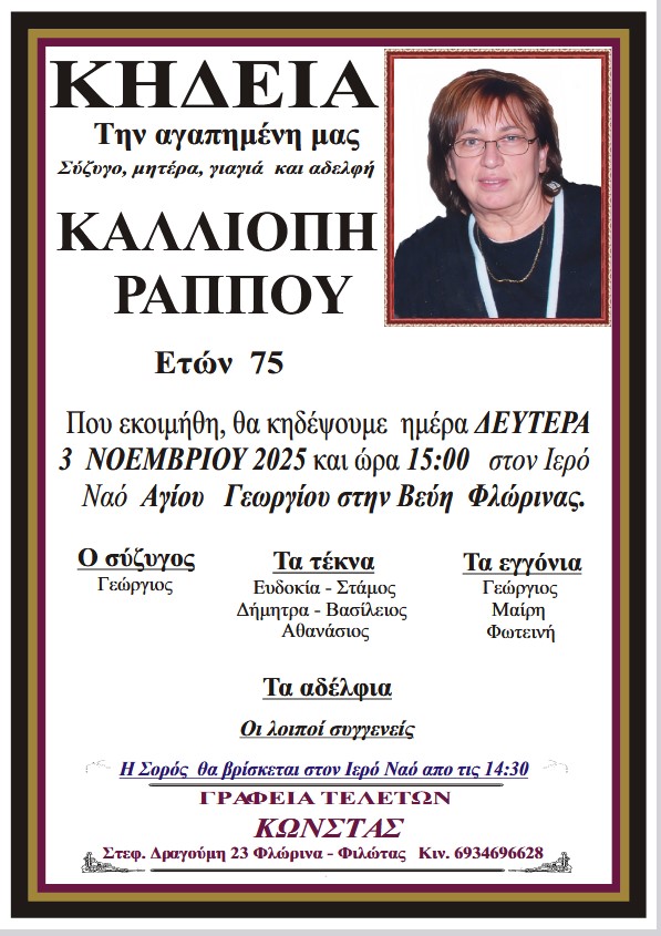 ΚοινωνικάΚηδεία της Καλλιόπης Ράππου, ετών 75 Κυριακή 2 Νοεμβρίου, 2025 14:29 florinapress.gr SHARE Ίσως να ενδιαφέρει ... Κηδεία της Ευγενίας Παπασωτηρίου ετών 89 Ετήσιο μνημόσυνο Στεφάνου Δόντσιου Άρχοντος Μουσικοδιδασκάλου Κηδεία του Παναγιώτη Τζαμπάζη, ετών 69 Ενοικιάζεται γκαρσονιέρα στο κέντρο της Φλώρινας Κηδεία της Ανδρομάχης Θεοδώρου Share Ακολουθήστε μας8.4kFollowersLikeΤελευταία νέα Αγανακτισμένοι αγρότες : Ως εδώ, η κατάσταση δεν πάει άλλο Κοινωνία Πέμπτη 4 Δεκεμβρίου, 2025 Επισκέψεις Κινητών Μονάδων Υγείας σε απομακρυσμένες Κοινότητες του Δήμου Αμυνταίου Κοινωνία Πέμπτη 4 Δεκεμβρίου, 2025 Ευχαριστήρια επιστολή του Πειραματικού Σχολείου Φλώρινας προς το Κέντρο Περιβαλλοντικής Εκπαίδευσης & Αειφορίας Μελίτης Κοινωνία Πέμπτη 4 Δεκεμβρίου, 2025 Πωλείται Γερμανικός λέβητας ξύλου Κοινωνία Πέμπτη 4 Δεκεμβρίου, 2025