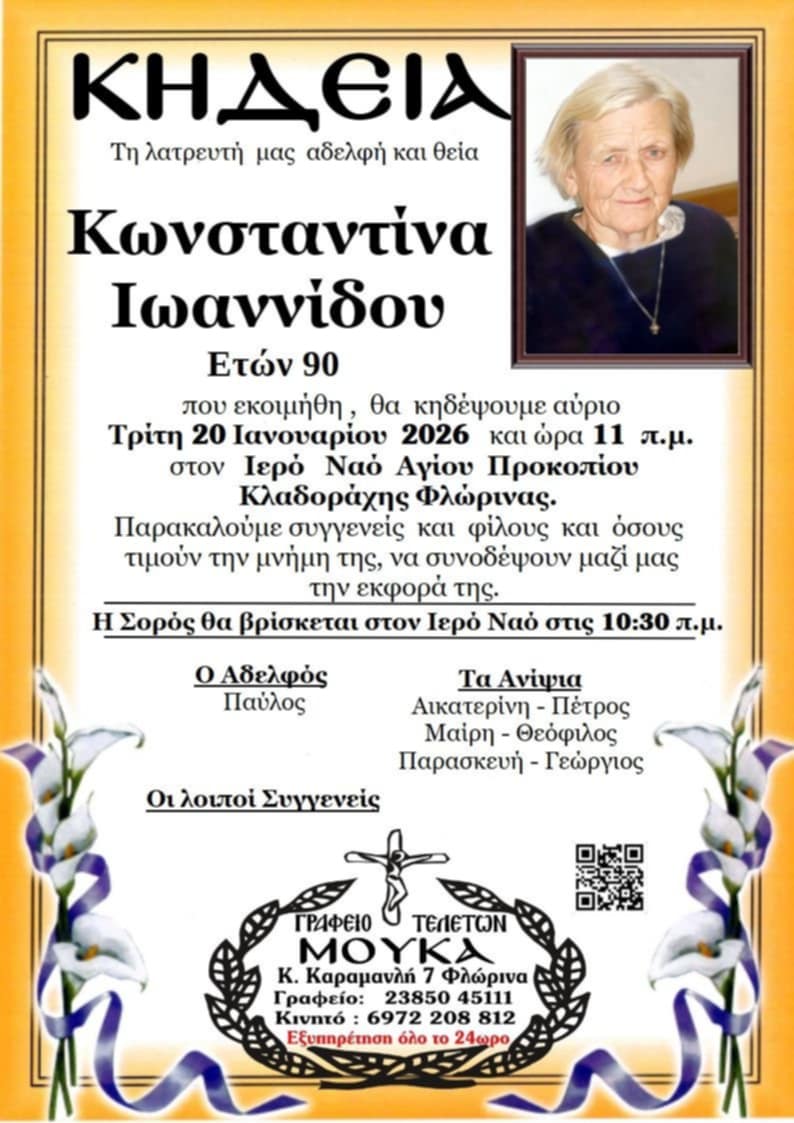 ΚοινωνικάΚηδεία της Κωνσταντίνας Ιωαννίδου, ετών 90 Δευτέρα 19 Ιανουαρίου, 2026 20:37 florinapress.gr SHARE Ίσως να ενδιαφέρει ... Ετήσιο μνημόσυνο του Θωμά Γεράση Κηδεία της Δέσποινας Τοσουνίδου, ετών 93 Κηδεία της Κυριακής Αποστόλου, ετών 89 Κηδεία του Ελευθερίου Στυλιάδη, ετών 91 Συλλυπητήριο μήνυμα του Θεόδωρου Καρυπίδη Share Ακολουθήστε μας8.4kFollowersLikeΤελευταία νέα Κινηματογραφικές προβολές της Λέσχης Πολιτισμού Φλώρινας Πολιτισμός Δευτέρα 19 Ιανουαρίου, 2026 Ο Ετήσιος χορός του Συλλόγου Θεσσαλών και φίλων Ν. Φλώρινας Εκδηλώσεις Πολιτισμός Δευτέρα 19 Ιανουαρίου, 2026 Καπνιστήρι – θυμιατήρι Κοινωνία Δευτέρα 19 Ιανουαρίου, 2026 Κηδεία της Δήμητρας Πάνου, ετών 85 Κοινωνικά Δευτέρα 19 Ιανουαρίου, 2026