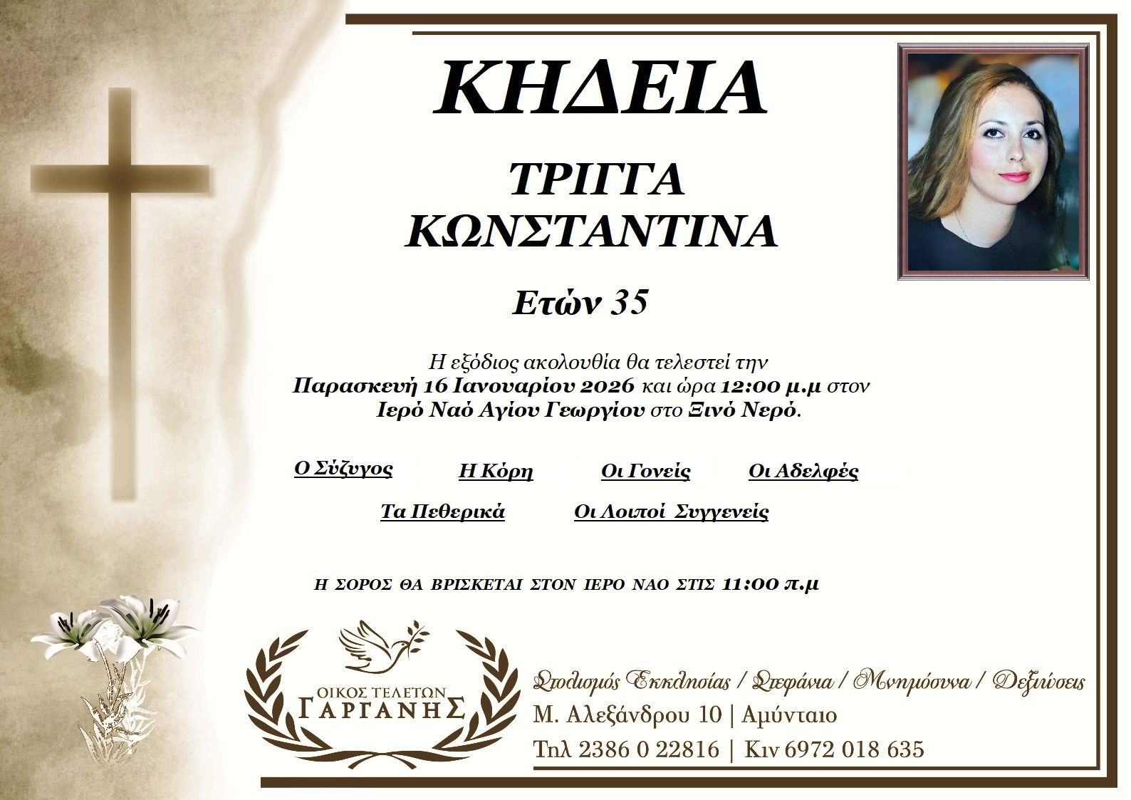 ΚοινωνικάΚηδεία της Κωνσταντίνας Τρίγγα, ετών 35 Πέμπτη 15 Ιανουαρίου, 2026 18:07 florinapress.gr SHARE Ίσως να ενδιαφέρει ... Κηδεία του Γιώργου Σαλαπάνη ετών 66 Κηδεία του Παύλου Ζαχαρία, ετών 52 Κηδεία της Αγγελικής Χατζηϊωάννου Κηδεία του Νικήτα Σταυρίδη, ετών 76 Κηδεία της Αναστασίας Οτζάκη Share Ακολουθήστε μας8.4kFollowersLikeΤελευταία νέα 10.000 νέες θέσεις εργασίας για άνεργες γυναίκες – Πλήρης και μερική απασχόληση με έμφαση στη μητρότητα Κοινωνία Παρασκευή 16 Ιανουαρίου, 2026 Ο ετήσιος χορός του Συλλόγου Θεσσαλών και φίλων Ν. Φλώρινας Εκδηλώσεις Πολιτισμός Παρασκευή 16 Ιανουαρίου, 2026 Πρόγραμμα Αγώνων Α’ & Β’ Κατηγορίας ΕΠΣ Φλώρινας 17 & 18/1/2026 Αθλητισμός Παρασκευή 16 Ιανουαρίου, 2026 Συγχαρητήριο μήνυμα του Αντιπεριφερειάρχη Φλώρινας Αθανάσιου Τάσκα στους Ιωάννη Μπλάγα και Γεώργιο Αναστασιάδη για την προαγωγή τους στον βαθμό του Ταξιάρχου Κοινωνία Πολιτισμός Πέμπτη 15 Ιανουαρίου, 2026