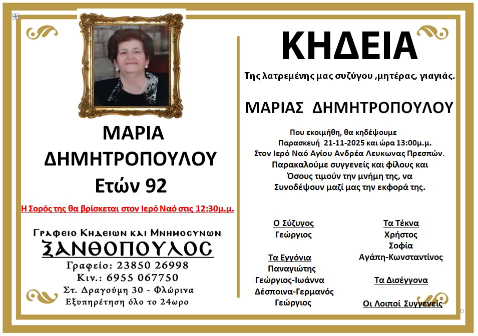ΚοινωνικάΚηδεία της Μαρίας Δημητροπούλου, ετών 92 Πέμπτη 20 Νοεμβρίου, 2025 13:44 florinapress.gr SHARE Ίσως να ενδιαφέρει ... Πένθιμο αγγελτήριο: Κηδεία της Πηνελόπης Λιάλιου Κηδεία του Χρήστου Λόλα Κηδεία της Αγάπης Βασιλείου, ετών 62 Κηδεία της Σοφίας Λαζαρίδου, ετών 98 Κηδεία του Μπαρδάκα Γεωργίου, ετών 80 Share Ακολουθήστε μας8.4kFollowersLikeΤελευταία νέα Αγανακτισμένοι αγρότες : Ως εδώ, η κατάσταση δεν πάει άλλο Κοινωνία Πέμπτη 4 Δεκεμβρίου, 2025 Επισκέψεις Κινητών Μονάδων Υγείας σε απομακρυσμένες Κοινότητες του Δήμου Αμυνταίου Κοινωνία Πέμπτη 4 Δεκεμβρίου, 2025 Ευχαριστήρια επιστολή του Πειραματικού Σχολείου Φλώρινας προς το Κέντρο Περιβαλλοντικής Εκπαίδευσης & Αειφορίας Μελίτης Κοινωνία Πέμπτη 4 Δεκεμβρίου, 2025 Πωλείται Γερμανικός λέβητας ξύλου Κοινωνία Πέμπτη 4 Δεκεμβρίου, 2025