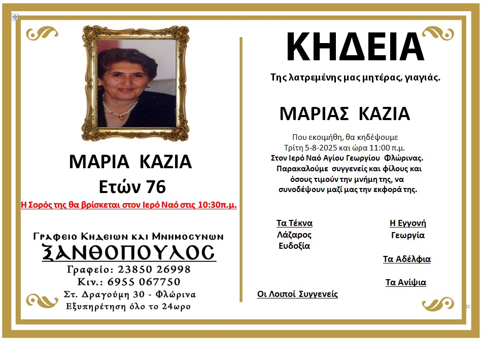 ΚοινωνικάΚηδεία της Μαρίας Καζία, ετών 76 Δευτέρα 4 Αυγούστου, 2025 19:59 florinapress.gr SHARE Ίσως να ενδιαφέρει ... Κηδεία του Σωτήριου Πέιου Κηδεία του Θωμά Τσώτσου, ετών 57 Κηδεία του Νικολάου Δημητριάδη, ετών 84 Κηδεία της Βικτωρίας Καλπάκα Κηδεία του Γεωργίου Μπραγιάννη, ετών 56 Share Ακολουθήστε μας8.4kFollowersLikeΤελευταία νέα Αγανακτισμένοι αγρότες : Ως εδώ, η κατάσταση δεν πάει άλλο Κοινωνία Πέμπτη 4 Δεκεμβρίου, 2025 Επισκέψεις Κινητών Μονάδων Υγείας σε απομακρυσμένες Κοινότητες του Δήμου Αμυνταίου Κοινωνία Πέμπτη 4 Δεκεμβρίου, 2025 Ευχαριστήρια επιστολή του Πειραματικού Σχολείου Φλώρινας προς το Κέντρο Περιβαλλοντικής Εκπαίδευσης & Αειφορίας Μελίτης Κοινωνία Πέμπτη 4 Δεκεμβρίου, 2025 Πωλείται Γερμανικός λέβητας ξύλου Κοινωνία Πέμπτη 4 Δεκεμβρίου, 2025