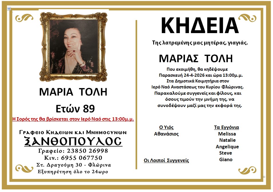 ΚοινωνικάΚηδεία της Μαρίας Τόλη, ετών 89 Πέμπτη 23 Απριλίου, 2026 20:29 florinapress.gr SHARE Ίσως να ενδιαφέρει ... Κηδεία του Κωνσταντίνου Δεράλα, ετών 77 Κηδεία της Γεωργιάδου Βιολέτας ετών 59 Κηδεία του Διονύση Μικρόπουλου, ετών 81 Ψήφισμα του ΤΕΕ Ν. ΦΛΩΡΙΝΑΣ Τεσσαρακονθήμερο μνημόσυνο του Ιωάννη Κίτσου Share Ακολουθήστε μας8.4kFollowersLikeΤελευταία νέα Σχολή προπονητών UEFA-C από ΕΠΣ Κοζάνης / ΕΠΣ Φλώρινας Αθλητισμός Πέμπτη 23 Απριλίου, 2026 Διακοπή ηλεκτροδότησης στη ΒΙΠΕ Φλώρινας και σε Τ.Κ. Δήμου Φλώρινας Κοινωνία Πέμπτη 23 Απριλίου, 2026 Χρηστίδειος Τελετή 2026: Ευχαριστίες και συγχαρητήρια από τη Διεύθυνση Δευτεροβάθμιας Εκπαίδευσης Φλώρινας Κοινωνία Πέμπτη 23 Απριλίου, 2026 Σταύρος Παπασωτηρίου: Χαιρετισμός θεματικής Ημερίδας «Φλώρινα: Τουρισμός με Ταυτότητα – Χτίζοντας έναν Αυθεντικό Προορισμό» Πολιτική Πέμπτη 23 Απριλίου, 2026