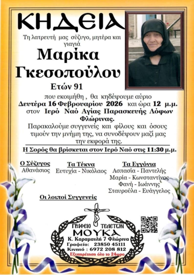 ΚοινωνικάΚηδεία της Μαρίκας Γκεσοπούλου, ετών 91 Κυριακή 15 Φεβρουαρίου, 2026 22:16 florinapress.gr SHARE Ίσως να ενδιαφέρει ... Συλλυπητήριο Ερμή Κηδεία της Κλεοπάτρας Χαραβιτσίδου Κηδεία του Γεωργίου Παπαϊωάννου Κηδεία του Θεόδωρου Ψωμιάδη, ετών 74 Κηδεία της Ειρήνης Κυριαζή Share Ακολουθήστε μας8.4kFollowersLikeΤελευταία νέα Ξεκίνησε η ατομική έκθεση ζωγραφικής της Χριστίνας Σαββάκη Εκδηλώσεις Πολιτισμός Κυριακή 15 Φεβρουαρίου, 2026 Ευχαριστήριο μήνυμα του Συλλόγου Συνταξιούχων Δασκάλων και Νηπιαγωγών Φλώρινας Κοινωνία Κυριακή 15 Φεβρουαρίου, 2026 Συλλυπητήριο μήνυμα του Συλλόγου Συνταξιούχων Δασκάλων και Νηπιαγωγών Κοινωνία Κυριακή 15 Φεβρουαρίου, 2026 Ευχαριστήριο του 3ου Γυμνασίου Φλώρινας Κοινωνία Κυριακή 15 Φεβρουαρίου, 2026