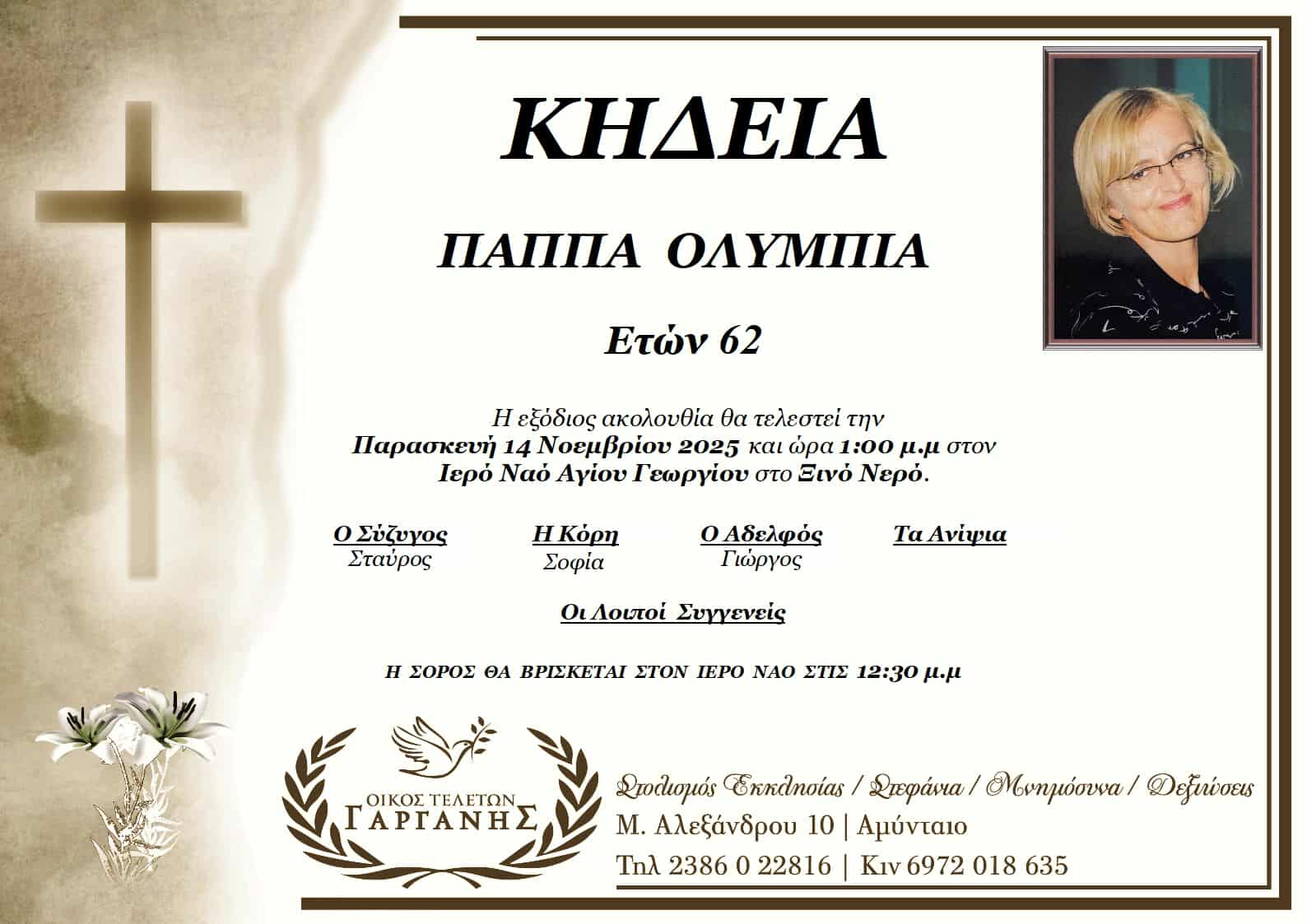 ΚοινωνικάΚηδεία της Ολυμπίας Παππά, ετών 62 Πέμπτη 13 Νοεμβρίου, 2025 16:04 florinapress.gr SHARE Ίσως να ενδιαφέρει ... Συλλυπητήρια Επιστολή του Διευθυντή και του Συλλόγου διδασκόντων του Εκκλησιαστικού Γυμνασίου-Γενικού Εκκλησιαστικού Λυκείου Φλώρινας Κηδεία της Σουλτάνας Σουλτάνογλου, ετών 86 Κηδεία του Αλέξανδρου Τορμπάκη, ετών 89 Κηδεία του Εμμανουήλ Ηλία, ετών 88 Κηδεία του Ευάγγελου Τερψόπουλου, ετών 83 Share Ακολουθήστε μας8.4kFollowersLikeΤελευταία νέα Αγανακτισμένοι αγρότες : Ως εδώ, η κατάσταση δεν πάει άλλο Κοινωνία Πέμπτη 4 Δεκεμβρίου, 2025 Επισκέψεις Κινητών Μονάδων Υγείας σε απομακρυσμένες Κοινότητες του Δήμου Αμυνταίου Κοινωνία Πέμπτη 4 Δεκεμβρίου, 2025 Ευχαριστήρια επιστολή του Πειραματικού Σχολείου Φλώρινας προς το Κέντρο Περιβαλλοντικής Εκπαίδευσης & Αειφορίας Μελίτης Κοινωνία Πέμπτη 4 Δεκεμβρίου, 2025 Πωλείται Γερμανικός λέβητας ξύλου Κοινωνία Πέμπτη 4 Δεκεμβρίου, 2025