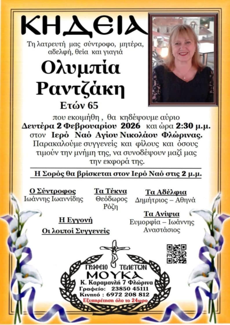 ΚοινωνικάΚηδεία της Ολυμπίας Ραντζάκη, ετών 65 Κυριακή 1 Φεβρουαρίου, 2026 09:52 florinapress.gr SHARE Ίσως να ενδιαφέρει ... Τεσσαρακονθήμερο μνημόσυνο της Άννας Σεχίδου Κηδεία του Δημητρίου Μήσσια Κηδεία της Χρυσάνθης Κυριαζή, ετών 92 Κηδεία του Θωμά Γκίνη, ετών 69 Κηδεία του Κωνσταντίνου Συντάκη, ετών 36 Share Ακολουθήστε μας8.4kFollowersLikeΤελευταία νέα Συλλυπητήριο μήνυμα του Συλλόγου Διδασκόντων του Πρότυπου Εκκλησιαστικού Γυμνασίου – Λυκείου Φλώρινας Κοινωνία Σάββατο 31 Ιανουαρίου, 2026 Κηδεία της Ζαχαρούλας Παπαβασιλείου, ετών 86 Κοινωνικά Σάββατο 31 Ιανουαρίου, 2026 Συλλυπητήριο του 2ου Δημοτικού Σχολείου Φλώρινας Κοινωνία Σάββατο 31 Ιανουαρίου, 2026 Συλλυπητήριο μήνυμα του 8ου Νηπιαγωγείου Φλώρινας Κοινωνία Σάββατο 31 Ιανουαρίου, 2026