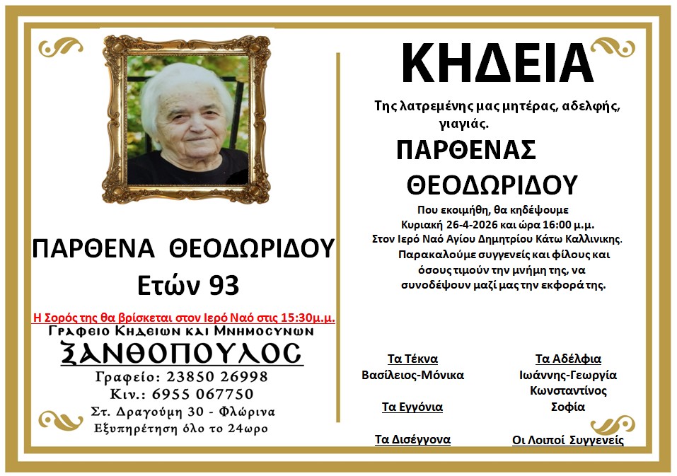 ΚοινωνικάΚηδεία της Παρθένας Θεοδωρίδου, ετών 93 Κυριακή 26 Απριλίου, 2026 13:22 florinapress.gr SHARE Ίσως να ενδιαφέρει ... Ευχαριστήριο του Δ.Σ. της Ευξείνου Λέσχης Φλώρινας Κηδεία της Φανής Παυλίδου, ετών 83 Κηδεία του Λάζαρου Τσάφκα Κηδεία του Γεωργίου (Νούρη) Παπαλαζαρίδη Ευχαριστήριο της οικογένειας Χατζητύπη Share Ακολουθήστε μας8.4kFollowersLikeΤελευταία νέα Η εκδήλωση «Σχέδιο Ανάπτυξης για τη Φλώρινα: Επιχειρήσεις, Επενδύσεις, Εργασία» με ομιλητή τον Γιώργο Αυτιά Εκδηλώσεις Πολιτική Κυριακή 26 Απριλίου, 2026 Κηδεία της Πετρίνας Γιάμου, ετών 87 Κοινωνικά Κυριακή 26 Απριλίου, 2026 Ευχαριστήριο του 1ου ΕΠΑΛ Φλώρινας προς την εταιρεία “B&T Composites” Κοινωνία Κυριακή 26 Απριλίου, 2026 Εξόρμηση της Αναρριχητικής Ομάδας Φλώρινας στο πεδίο «2 Κυδωνιές» Αθλητισμός Κυριακή 26 Απριλίου, 2026