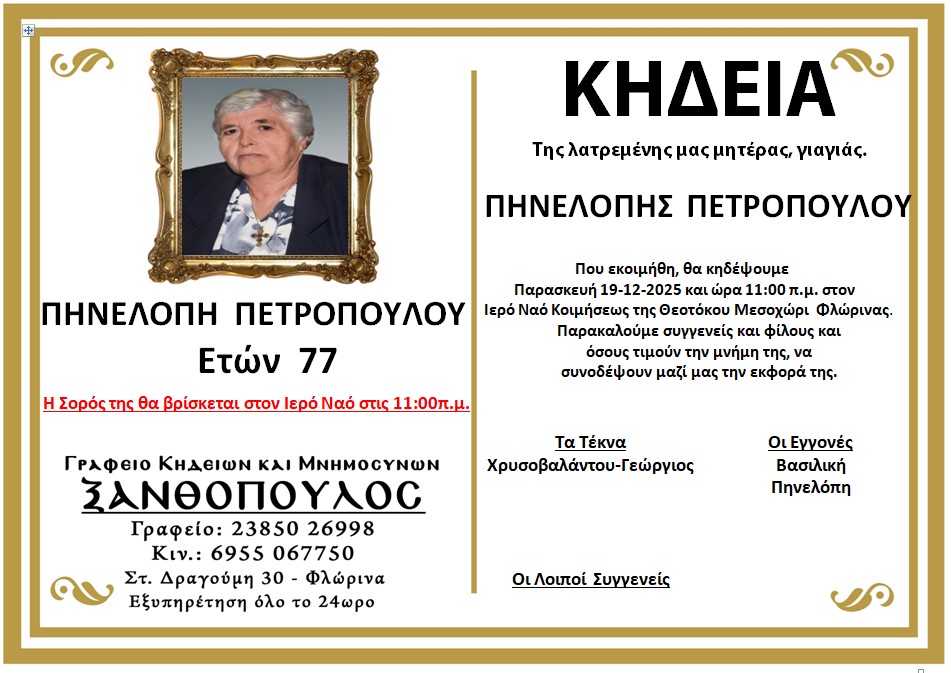 ΚοινωνικάΚηδεία της Πηνελόπης Πετροπούλου, ετών 77 Πέμπτη 18 Δεκεμβρίου, 2025 19:33 florinapress.gr SHARE Ίσως να ενδιαφέρει ... Κηδεία της Ελεονώρας Βάσσιου, ετών 90 Κηδεία της Αλίκης Βερμπελή, ετών 76 Κηδεία της Ουρανίας Κουτουράτσα, ετών 93 Κηδεία του Σάββα Ευσταθιάδη, ετών 80 Κηδεία της Ακριβούλας Γιαλαμά, ετών 88 Share Ακολουθήστε μας8.4kFollowersLikeΤελευταία νέα Σταύρος Παπασωτηρίου: «Καταβολή αποζημιώσεων στους αγρότες μας για τα προανθικά του 2021» Πολιτική Πέμπτη 18 Δεκεμβρίου, 2025 Ευχετήρια κάρτα της Σχολής Γεωπονικών Επιστημών του Πανεπιστημίου Δυτικής Μακεδονίας Κοινωνία Πέμπτη 18 Δεκεμβρίου, 2025 Ευχές του Βορειοηπειρωτικού Συλλόγου Φλωρίνης και πέριξ Κοινωνία Πέμπτη 18 Δεκεμβρίου, 2025 Κηδεία του Ιωάννη Δομαζέτη, ετών 73 Κοινωνικά Πέμπτη 18 Δεκεμβρίου, 2025