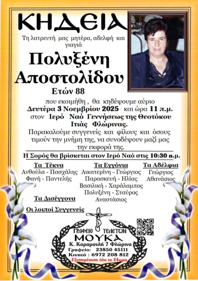 ΚοινωνικάΚηδεία της Πολυξένης Αποστολίδου, ετών 88 Κυριακή 2 Νοεμβρίου, 2025 14:36 florinapress.gr SHARE Ίσως να ενδιαφέρει ... Κηδεία του Παναγιώτη Μαβίδη, ετών 58 Κηδεία της Αθηνάς Κωτσαλίδου ετών 89 Κηδεία του Νικολάου Μιτσκίνη, ετών 68 Κηδεία της Άννας Κατίνη, ετών 84 Κηδεία της Ευθυμίας Ρωμανίδου, ετών 92 Share Ακολουθήστε μας8.4kFollowersLikeΤελευταία νέα Αγανακτισμένοι αγρότες : Ως εδώ, η κατάσταση δεν πάει άλλο Κοινωνία Πέμπτη 4 Δεκεμβρίου, 2025 Επισκέψεις Κινητών Μονάδων Υγείας σε απομακρυσμένες Κοινότητες του Δήμου Αμυνταίου Κοινωνία Πέμπτη 4 Δεκεμβρίου, 2025 Ευχαριστήρια επιστολή του Πειραματικού Σχολείου Φλώρινας προς το Κέντρο Περιβαλλοντικής Εκπαίδευσης & Αειφορίας Μελίτης Κοινωνία Πέμπτη 4 Δεκεμβρίου, 2025 Πωλείται Γερμανικός λέβητας ξύλου Κοινωνία Πέμπτη 4 Δεκεμβρίου, 2025