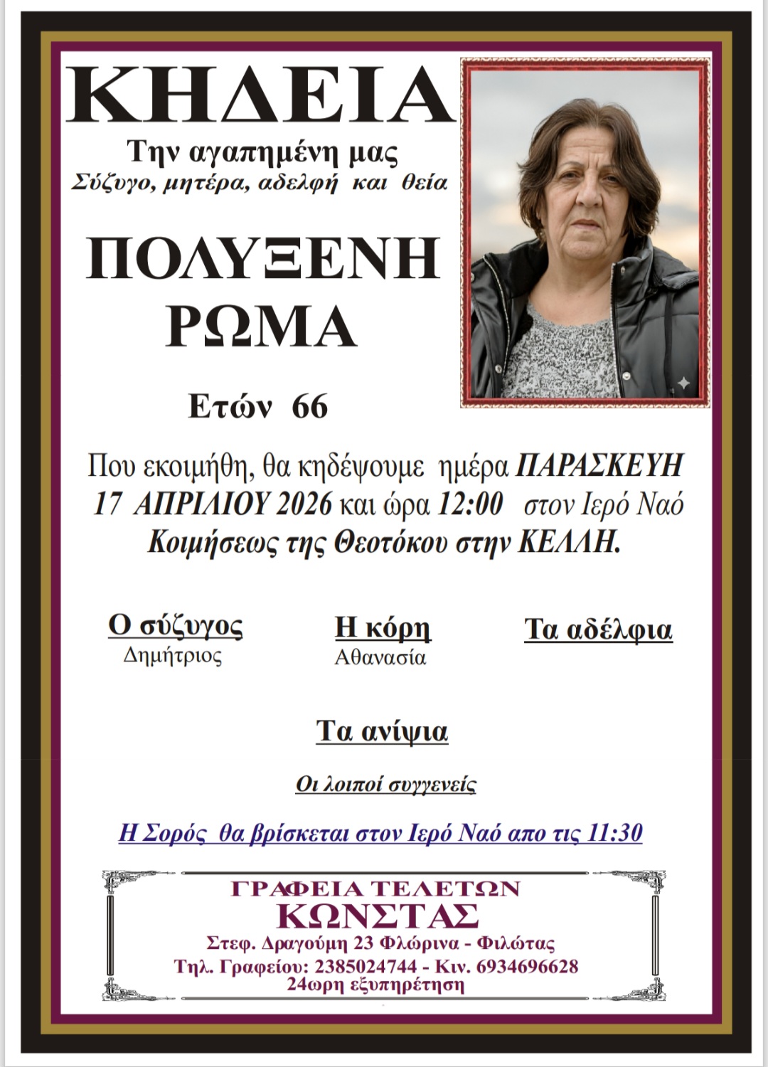 ΚοινωνικάΚηδεία της Πολυξένης Ρώμα, ετών 66 Πέμπτη 16 Απριλίου, 2026 09:37 florinapress.gr SHARE Ίσως να ενδιαφέρει ... Ευχαριστήριο του Συλλόγου Γονέων και Κηδεμόνων του 2ου Δημοτικού Σχολείου Φλώρινας Κηδεία της Ελένης Σαπουντζή, ετών 91 Κηδεία της Νέλης Τσιρίδου, ετών 74 Κηδεία της Μαρίνας Γκοσμάνη, ετών 64 Ενοικιάζεται γκαρσονιέρα στο κέντρο της Φλώρινας Share Ακολουθήστε μας8.4kFollowersLikeΤελευταία νέα Συλλυπητήριο μήνυμα του Συλλόγου Δημοτικών Υπαλλήλων Δήμων Φλώρινας, Αμυνταίου και Πρεσπών Κοινωνία Τετάρτη 15 Απριλίου, 2026 Δράσεις Μαρτίου του Ερυθρού Σταυρού Φλώρινας Κοινωνία Τετάρτη 15 Απριλίου, 2026 ΓΕΦ: Αξιόλογη παρουσία της Δούμτση στο Παγκόσμιο Πρωτάθλημα στο Ρίο Αθλητισμός Τετάρτη 15 Απριλίου, 2026 Αμμόχωστος Κοινωνία Τετάρτη 15 Απριλίου, 2026