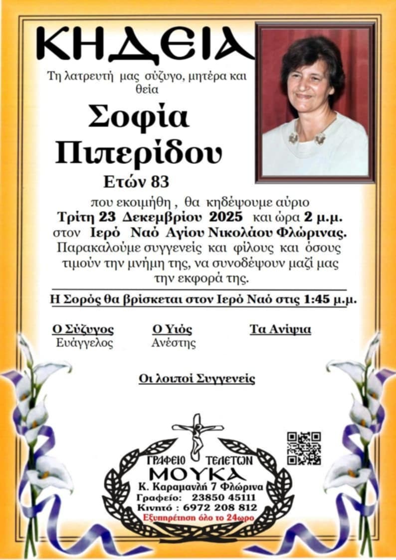 ΚοινωνικάΚηδεία της Σοφίας Πιπερίδου, ετών 83 Δευτέρα 22 Δεκεμβρίου, 2025 19:42 florinapress.gr SHARE Ίσως να ενδιαφέρει ... Κηδεία της Ελένης Μιχάλτση, ετών 85 Κηδεία του Χαράλαμπου Δαμιανίδη, ετών 62 Κηδεία του Δημητρίου Μεκάση ετών 70 Κηδεία της Αιμηλίας Τάντση, ετών 98 Ευχαριστήριο του Γενικού Νοσοκομείου Φλώρινας Share Ακολουθήστε μας8.4kFollowersLikeΤελευταία νέα Η ΔΕΠΑ Εμπορίας αλλάζει πίστα Οικονομία Δευτέρα 22 Δεκεμβρίου, 2025 Χριστουγεννιάτικες νότες παράδοσης και παιδικών χαμόγελων από τους «Λυγκηστές» Πολιτισμός Δευτέρα 22 Δεκεμβρίου, 2025 Πώς να φωτογραφίσετε σωστά το έθιμο των Φωτιών. Δείτε το βίντεο από το webinar! Κοινωνία Δευτέρα 22 Δεκεμβρίου, 2025 Φωτιά σε διαμέρισμα πολυκατοικίας στη Φλώρινα Κοινωνία Δευτέρα 22 Δεκεμβρίου, 2025