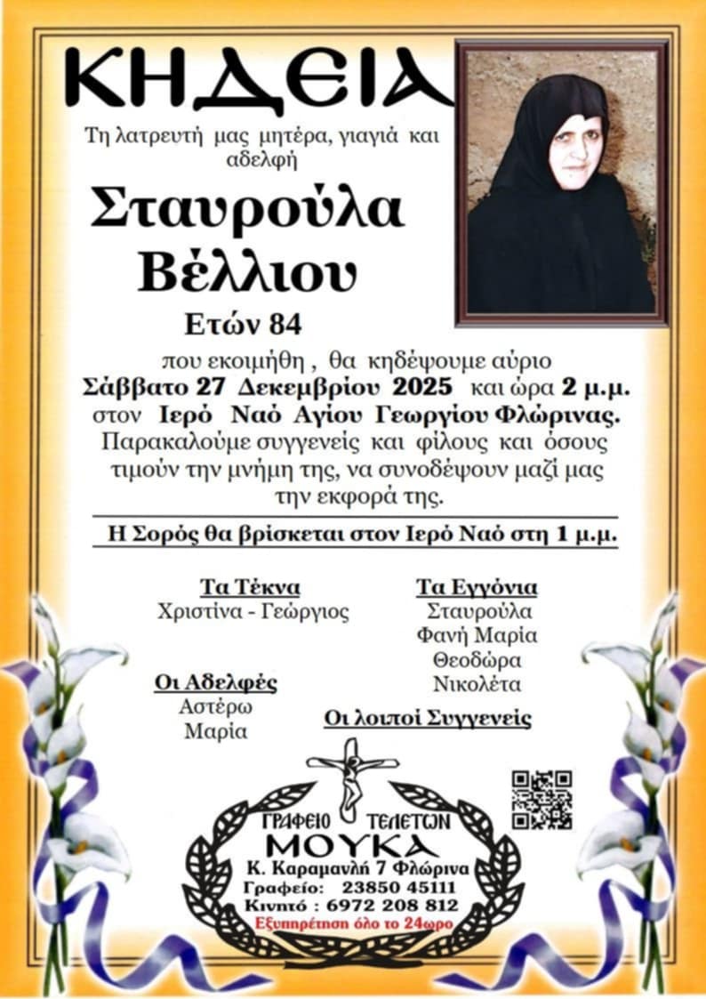 ΚοινωνικάΚηδεία της Σταυρούλας Βέλλιου, ετών 84 Παρασκευή 26 Δεκεμβρίου, 2025 21:12 florinapress.gr SHARE Ίσως να ενδιαφέρει ... Κηδεία της Μαρίας Νοτίδου, ετών 88 Κηδεία του Γεωργίου Αναγνωστόπουλου, Ιατρού, ετών 64 Κηδεία του Χρήστου Λόλα Κηδεία του Ιωάννη Κεσίδη, ετών 92 Κηδεία της Χρυσαυγής Καραντζίδου, ετών 99 Share Ακολουθήστε μας8.4kFollowersLikeΤελευταία νέα Εγκαίνια της έκθεσης επιχρωματισμένης φωτογραφίας: «Η Φλώρινα στις αρχές του 20ου αιώνα» του Ηλία Ιωανννίδη Εκδηλώσεις Πολιτισμός Παρασκευή 26 Δεκεμβρίου, 2025 Πραγματοποιήθηκε ο ετήσιος χορός του Α.Σ. Άρης Λόφων Εκδηλώσεις Πολιτισμός Παρασκευή 26 Δεκεμβρίου, 2025 Με γιορτή σοκολάτας και δράσεις για παιδιά συνεχίζονται οι Χριστουγεννιάτικες εκδηλώσεις του Δήμου Φλώρινας Εκδηλώσεις Πολιτισμός Παρασκευή 26 Δεκεμβρίου, 2025 Μνημόσυνα Σαββάτου 27 και Κυριακής 28 Δεκεμβρίου Κοινωνικά Παρασκευή 26 Δεκεμβρίου, 2025