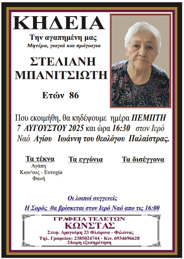 ΚοινωνικάΚηδεία της Στελιανής Μπανιτσιώτη, ετών 86 Τετάρτη 6 Αυγούστου, 2025 22:44 florinapress.gr SHARE Ίσως να ενδιαφέρει ... Κηδεία της Αγάπης Μίνου – Ποντίκη, ετών 61 Κηδεία της Μαρίας Γουσοπούλου – Νικέζη, ετών 75 Κηδεία του Ιωάννη Μπούρα Κηδεία της Σεβαστής Αντωνιάδου, ετών 88 Κηδεία της Μαρίας Αβραμίδου, ετών 91 Share Ακολουθήστε μας8.4kFollowersLikeΤελευταία νέα Αγανακτισμένοι αγρότες : Ως εδώ, η κατάσταση δεν πάει άλλο Κοινωνία Πέμπτη 4 Δεκεμβρίου, 2025 Επισκέψεις Κινητών Μονάδων Υγείας σε απομακρυσμένες Κοινότητες του Δήμου Αμυνταίου Κοινωνία Πέμπτη 4 Δεκεμβρίου, 2025 Ευχαριστήρια επιστολή του Πειραματικού Σχολείου Φλώρινας προς το Κέντρο Περιβαλλοντικής Εκπαίδευσης & Αειφορίας Μελίτης Κοινωνία Πέμπτη 4 Δεκεμβρίου, 2025 Πωλείται Γερμανικός λέβητας ξύλου Κοινωνία Πέμπτη 4 Δεκεμβρίου, 2025