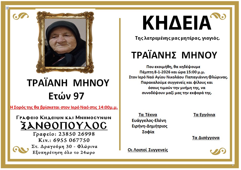 ΚοινωνικάΚηδεία της Τραϊανής Μήνου, ετών 97 Πέμπτη 8 Ιανουαρίου, 2026 11:35 florinapress.gr SHARE Ίσως να ενδιαφέρει ... Κηδεία του Νικολάου Θωμαϊδη ετών 82 Τριετές μνημόσυνο της Αγάπης Θεοδώρου Κηδεία του Κωνσταντίνου Φέκου ετών 92 Κηδεία της Θεοδώρας Μπάτσιου, ετών 83 Κηδεία του Σάββα Ευσταθιάδη, ετών 80 Share Ακολουθήστε μας8.4kFollowersLikeΤελευταία νέα Ορισμός Υπευθύνων Θεματικών Τομέων Δράσης της ΔΕΕΠ ΝΔ Φλώρινας Πολιτική Πέμπτη 8 Ιανουαρίου, 2026 Στη Φλώρινα ο πρόεδρος του ΠΑΣΟΚ Νίκος Ανδρουλάκης Πολιτική Πέμπτη 8 Ιανουαρίου, 2026 Ξεκινά η υποβολή προγραμμάτων κατάρτισης και με εξ αποστάσεως εκπαίδευση για ανέργους δικαιούχους Ελάχιστου Εγγυημένου Εισοδήματος Κοινωνία Πέμπτη 8 Ιανουαρίου, 2026 Περιφέρεια Δυτικής Μακεδονίας: Παράδοση ενός σύγχρονου drone στην Πυροσβεστική Διοίκηση Δυτικής Μακεδονίας Πολιτική Πέμπτη 8 Ιανουαρίου, 2026