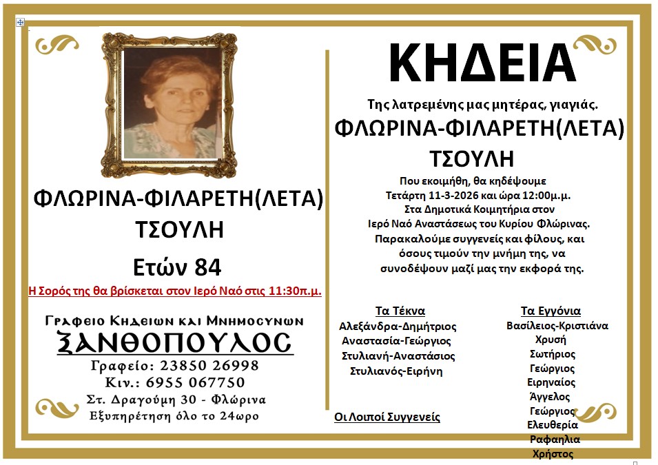 ΚοινωνικάΚηδεία της Φλωρίνας – Φιλαρέτης (Λέτας) Τσούλη, ετών 84 Τρίτη 10 Μαρτίου, 2026 12:09 florinapress.gr SHARE Ίσως να ενδιαφέρει ... Κηδεία της Μαρίας Βέρου, ετών 87 Κηδεία της Βασιλικής Κολώνη, ετών 80 Κηδεία της Ανδρομάχης Γκεσοπούλου Κηδεία της Πολυξένης Λιόντη, ετών 86 Κηδεία της Άννας Σιάγκα, ετών 29 Share Ακολουθήστε μας8.4kFollowersLikeΤελευταία νέα Ανοίγουν σήμερα οι αιτήσεις για τη νέα δράση κατάρτισης εργαζομένων της ΔΥΠΑ Κοινωνία Τρίτη 10 Μαρτίου, 2026 Έκθεση φωτογραφίας «1821» του Ηλία Περγαντή – Παρουσίαση φορεσιάς και αρματωσιάς του Αγωνιστή του 1821 στον «Αριστοτέλη» Εκδηλώσεις Πολιτισμός Τρίτη 10 Μαρτίου, 2026 Η Περιφέρεια Δυτικής Μακεδονίας θωρακίζει την κοινωνική συνοχή με νέες δομές αντιμετώπισης των εξαρτήσεων Κοινωνία Πολιτική Τρίτη 10 Μαρτίου, 2026 Εκλογοαπολογιστική Γενική Συνέλευση του Συλλόγου Πολυτέκνων Νομού Φλώρινας Κοινωνία Τρίτη 10 Μαρτίου, 2026