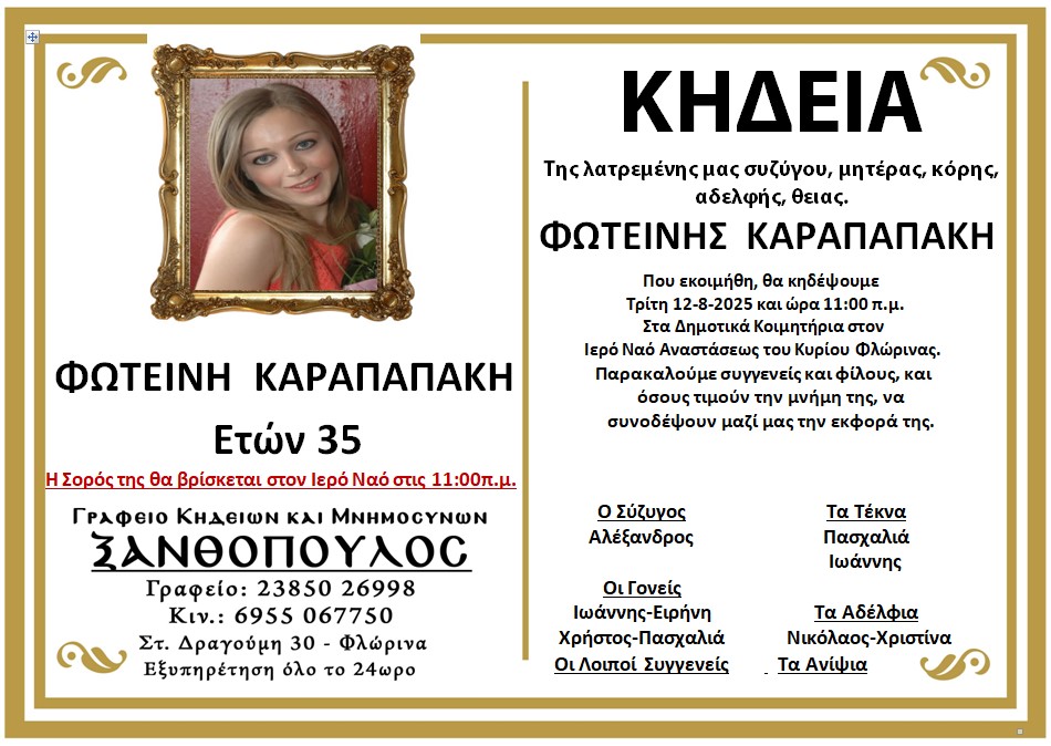 ΚοινωνικάΚηδεία της Φωτεινής Καραπαπάκη ετών 35 Δευτέρα 11 Αυγούστου, 2025 11:11 florinapress.gr SHARE Ίσως να ενδιαφέρει ... Η εκδήλωση του Συλλόγου Συνταξιούχων Δασκάλων και Νηπιαγωγών Φλώρινας με ομιλήτρια η Εριέτα Κολλάρη Αμ έπος αμ έργον οι Αμανατίδης-Τάσκας Προχωρούν τα έργα στην Πρέσπα με γρήγορους ρυθμούς Συνάντηση του βουλευτή Γ. Αντωνιάδη με τον υπουργό Εσωτερικών κ. Μ. Βορίδη Η παγκοσμιοποίηση, το προκαλούμενο σοκ από την Κίνα και τα μέτρα, για την αντιμετώπισή του Ευχαριστήριο του Περιφερειακού Τμήματος Φλώρινας του Ελληνικού Ερυθρού Σταυρού Share Ακολουθήστε μας8.4kFollowersLikeΤελευταία νέα Αγανακτισμένοι αγρότες : Ως εδώ, η κατάσταση δεν πάει άλλο Κοινωνία Πέμπτη 4 Δεκεμβρίου, 2025 Επισκέψεις Κινητών Μονάδων Υγείας σε απομακρυσμένες Κοινότητες του Δήμου Αμυνταίου Κοινωνία Πέμπτη 4 Δεκεμβρίου, 2025 Ευχαριστήρια επιστολή του Πειραματικού Σχολείου Φλώρινας προς το Κέντρο Περιβαλλοντικής Εκπαίδευσης & Αειφορίας Μελίτης Κοινωνία Πέμπτη 4 Δεκεμβρίου, 2025 Πωλείται Γερμανικός λέβητας ξύλου Κοινωνία Πέμπτη 4 Δεκεμβρίου, 2025