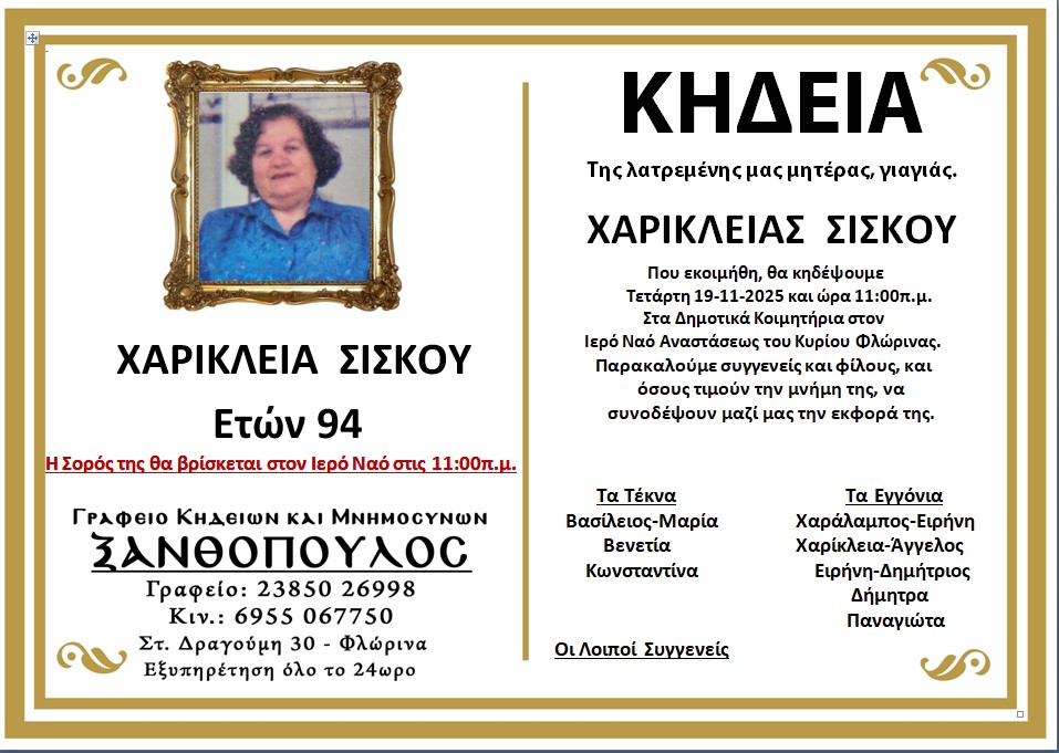 ΚοινωνικάΚηδεία της Χαρίκλειας Σίσκου, ετών 94 Τρίτη 18 Νοεμβρίου, 2025 12:49 florinapress.gr SHARE Ίσως να ενδιαφέρει ... Κηδεία του Χρήστου Πασχαλίδη, ετών 58 Συγχαρητήριο του Δ.Σ. του Φορέα Διαχείρισης του Εθνικού Πάρκου Πρεσπών Ευχαριστήριο του Πειραματικού Δημοτικού Σχολείου Φλώρινας Κηδεία του Τραϊανού Πεοβίτη, ετών 90 Κηδεία του Αθανασίου Περιβολάρη, ετών 87 Share Ακολουθήστε μας8.4kFollowersLikeΤελευταία νέα Αγανακτισμένοι αγρότες : Ως εδώ, η κατάσταση δεν πάει άλλο Κοινωνία Πέμπτη 4 Δεκεμβρίου, 2025 Επισκέψεις Κινητών Μονάδων Υγείας σε απομακρυσμένες Κοινότητες του Δήμου Αμυνταίου Κοινωνία Πέμπτη 4 Δεκεμβρίου, 2025 Ευχαριστήρια επιστολή του Πειραματικού Σχολείου Φλώρινας προς το Κέντρο Περιβαλλοντικής Εκπαίδευσης & Αειφορίας Μελίτης Κοινωνία Πέμπτη 4 Δεκεμβρίου, 2025 Πωλείται Γερμανικός λέβητας ξύλου Κοινωνία Πέμπτη 4 Δεκεμβρίου, 2025