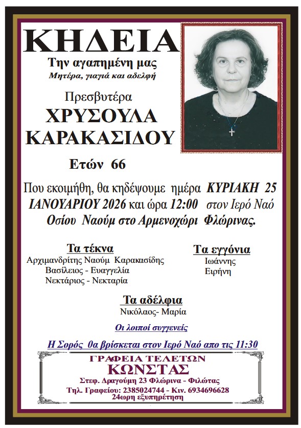 ΚοινωνικάΚηδεία της Χρυσούλας Καρακασίδου, ετών 66 Σάββατο 24 Ιανουαρίου, 2026 12:01 florinapress.gr SHARE Ίσως να ενδιαφέρει ... Ψήφισμα του Δημοτικού Συμβουλίου Φλώρινας Κηδεία της Θεοδώρας Πετσούκη, ετών 89 Κηδεία του Στογιάννη Τερψελά, ετών 95 Κηδεία του Ευαγγέλου Τότση, ετών 59 Κηδεία της Γεωργίας Σεβαστοπούλου, ετών 87 Share Ακολουθήστε μας8.4kFollowersLikeΤελευταία νέα Ο Σίμος Κωνσταντίνου των Λυγκηστών στο San Diego της Καλιφόρνιας, διδάσκοντας και μεταδίδοντας τον πολιτισμό και τη μουσικοχορευτική παράδοση της Φλώρινας Πολιτισμός Σάββατο 24 Ιανουαρίου, 2026 Ευχαριστήριο του Σωματείου «Λυγκηστές» – Ετήσιος Χορός Πολιτισμός Σάββατο 24 Ιανουαρίου, 2026 Συνάντηση του Προέδρου της ΚΟΦ Ελλάδας – Σουηδίας με τον Πρέσβη της Σουηδίας στην Ελλάδα Πολιτική Σάββατο 24 Ιανουαρίου, 2026 Διευκρίνιση σχετικά με πρόσφατο ευχαριστήριο δημοσίευμα για Δημόσιο Νοσοκομείο Επιστολές Κοινωνία Σάββατο 24 Ιανουαρίου, 2026