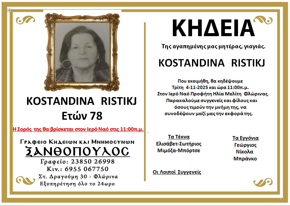 ΚοινωνικάΚηδεία της Kostandina Ristikj, ετών 78 Δευτέρα 3 Νοεμβρίου, 2025 11:26 florinapress.gr SHARE Ίσως να ενδιαφέρει ... Κηδεία του Νικολάου Θωμαϊδη ετών 82 Κηδεία της Χρυσαυγής Καραντζίδου, ετών 99 Κηδεία της Σουζάνας Ίνδου ετών 55 Κηδεία της Ουρανίας Στεφανίδου ετών 93 Κηδεία της Σοφίας Αλεξίου Share Ακολουθήστε μας8.4kFollowersLikeΤελευταία νέα Αγανακτισμένοι αγρότες : Ως εδώ, η κατάσταση δεν πάει άλλο Κοινωνία Πέμπτη 4 Δεκεμβρίου, 2025 Επισκέψεις Κινητών Μονάδων Υγείας σε απομακρυσμένες Κοινότητες του Δήμου Αμυνταίου Κοινωνία Πέμπτη 4 Δεκεμβρίου, 2025 Ευχαριστήρια επιστολή του Πειραματικού Σχολείου Φλώρινας προς το Κέντρο Περιβαλλοντικής Εκπαίδευσης & Αειφορίας Μελίτης Κοινωνία Πέμπτη 4 Δεκεμβρίου, 2025 Πωλείται Γερμανικός λέβητας ξύλου Κοινωνία Πέμπτη 4 Δεκεμβρίου, 2025