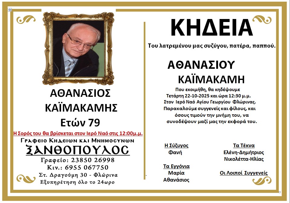 ΚοινωνικάΚηδεία του Αθανασίου Καϊμακάμη, ετών 79 Τρίτη 21 Οκτωβρίου, 2025 13:30 florinapress.gr SHARE Ίσως να ενδιαφέρει ... Κηδεία του Αθανασίου Μπούσιου, ετών 31 Κηδεία του Θεοδώρου Μπουτάκη, ετών 92 Ετήσιο μνημόσυνο του Χρήστου Κυριαζή Κηδεία του Νικολάου Δόντσου Κηδεία της Ανδρομάχης Γκεσοπούλου Share Ακολουθήστε μας8.4kFollowersLikeΤελευταία νέα Το Χριστουγεννιάτικο bazaar του Κέντρου Κοινωνικής Πρόνοιας Φλώρινας Εκδηλώσεις Πολιτισμός Κυριακή 7 Δεκεμβρίου, 2025 Ψήφισμα του Συνδέσμου Μοναστηριωτών και των Πέριξ εν Φλωρίνη «Η ΕΛΠΙΣ» Κοινωνία Σάββατο 6 Δεκεμβρίου, 2025 Ψήφισμα του Δημοτικού Συμβουλίου Φλώρινας Κοινωνία Σάββατο 6 Δεκεμβρίου, 2025 Συλλυπητήριο μήνυμα του Δημάρχου Φλώρινας Κοινωνία Σάββατο 6 Δεκεμβρίου, 2025